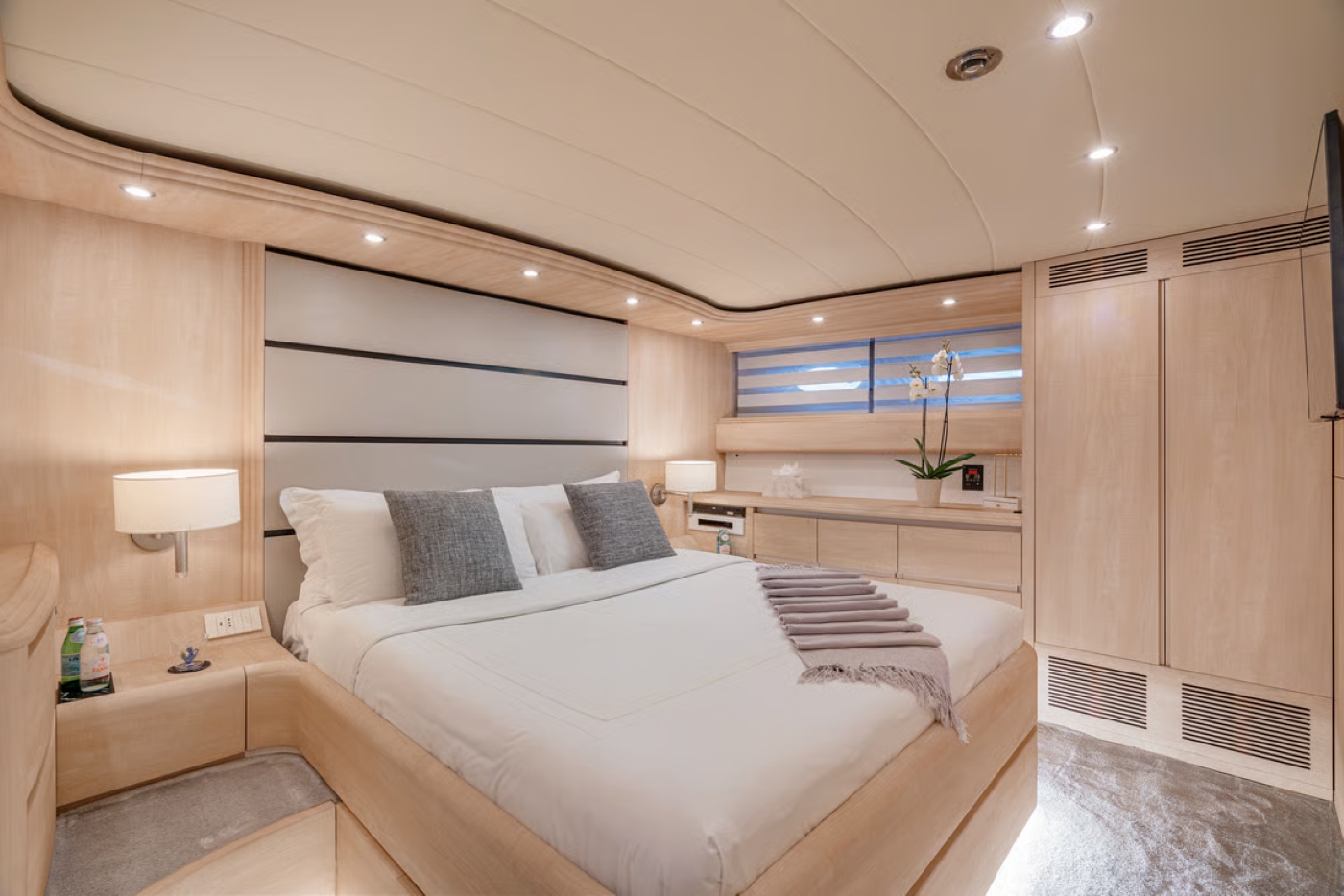In the salon, a large C-shaped sofa and table are placed under the port window, and a widescreen TV is mounted on the wall aft to starboard.