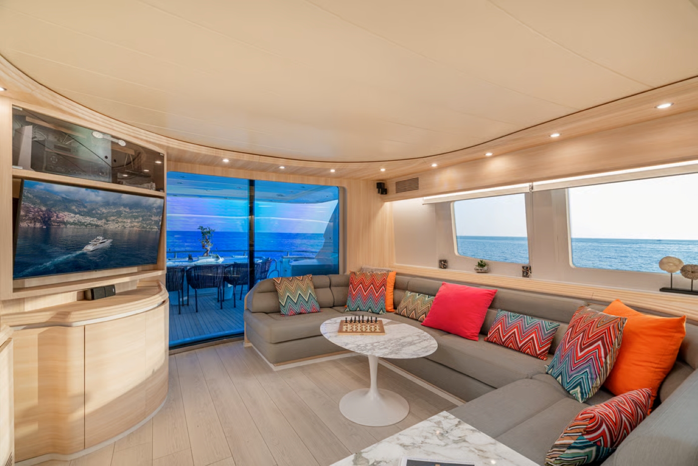 The circular dining table is placed forward to port in this space, illuminated by an abundance of natural ...