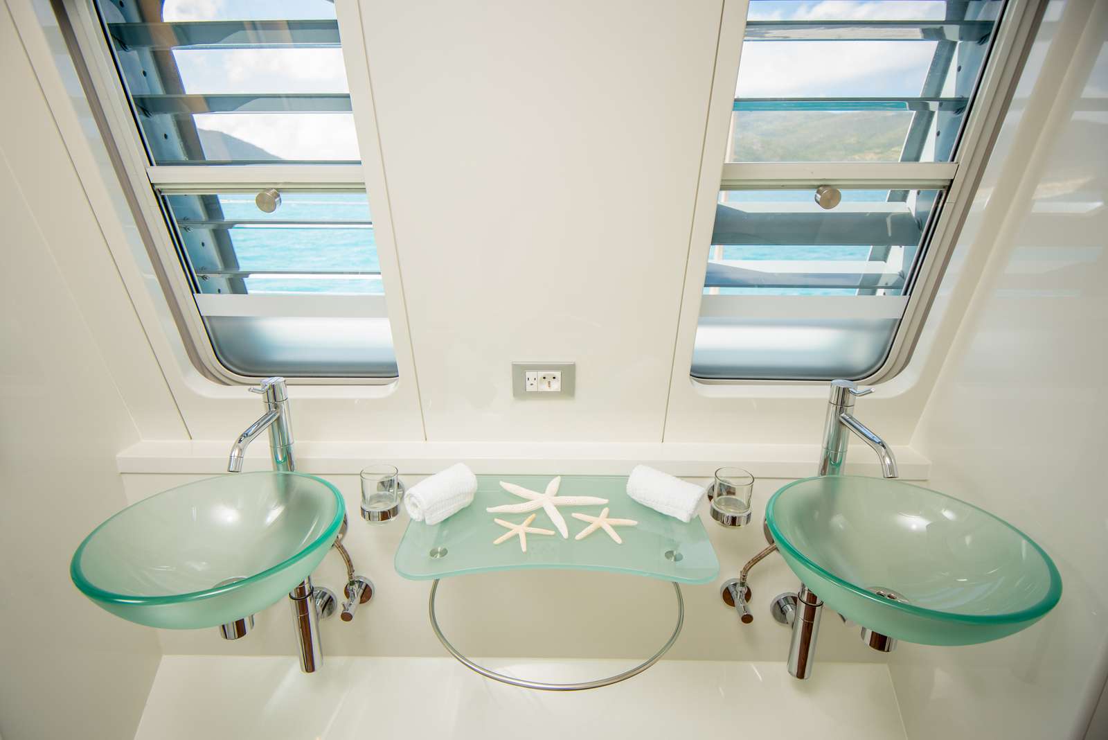 In the evening an area of the main saloon can be converted to sleep an additional two people, with a privacy screen, separate toilet and shower. Being a catamaran she is very stable and offers fantastic space.