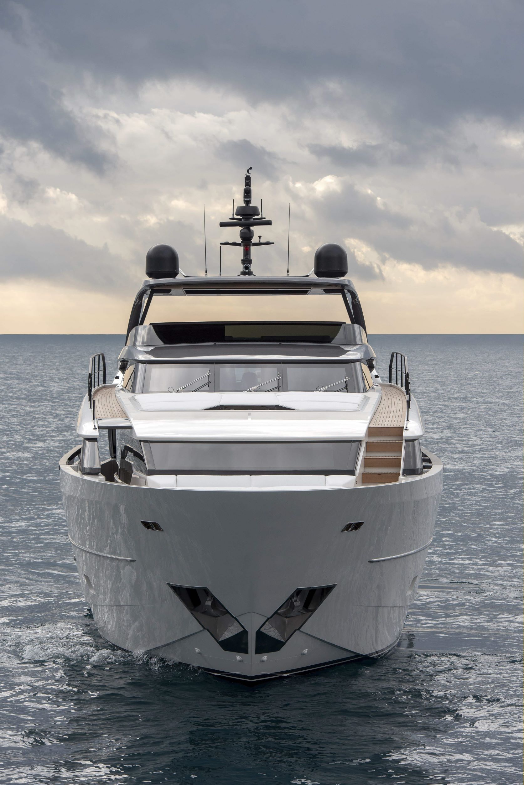 Two stairways lead down to the lower deck swim platform, which is spacious enough for sunbathing and lounging beside the sea. A port stairway joins to the flybridge above, and a starboard side walkway leads around to the foredeck.