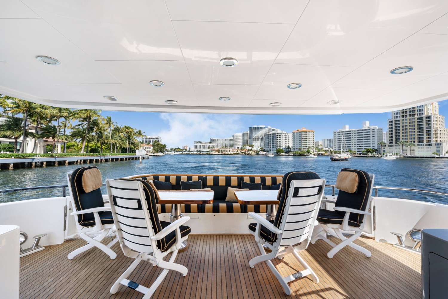 Behind, the main salon has a bar in the forward port corner, a wine chiller, a widescreen TV, sofa seating and a coffee table to port and armchairs and a side table to starboard.