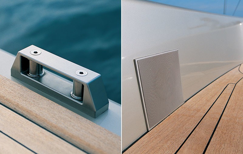 Her dual helms are aft of the cockpit, with an uninterrupted walkway connecting to the level aft deck. The yacht's wide side decks lead to the capacious foredeck, complete with flush hatches and plenty of relaxation areas.