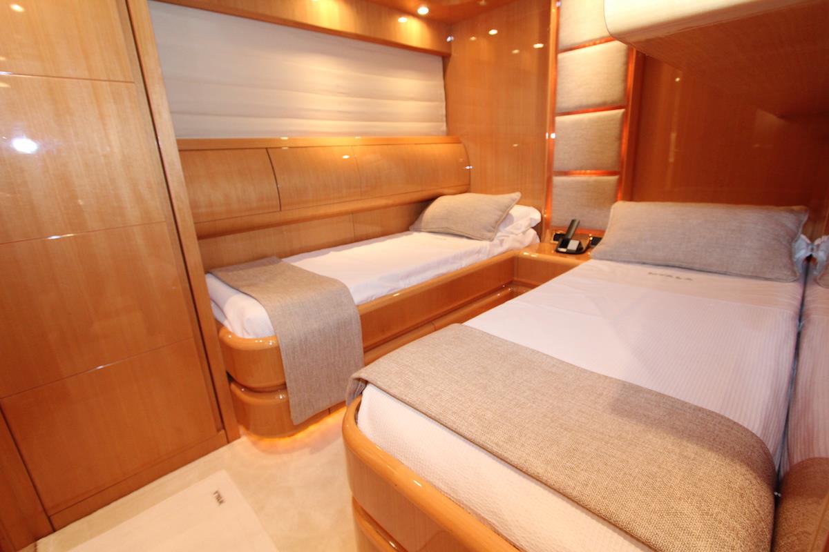 There is accommodation for 10 guests in four cabins. The spacious main cabin amidships, covers the full beam, with double bed, sofa, walk in wardrobe and large bathroom with shower. The VIP cabin is towards the bow with double bed, lots of wardrobe space, and bathroom.