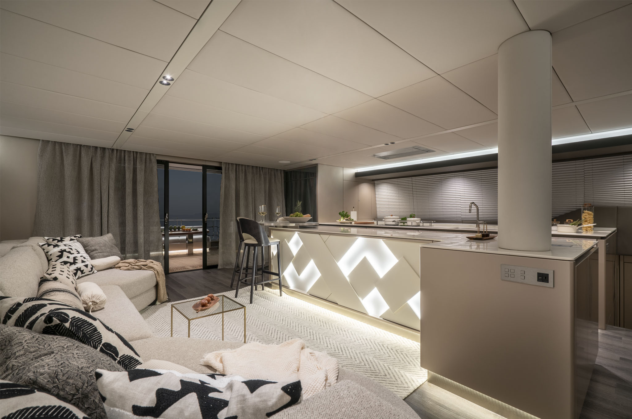 The catamaran’s main deck saloon comprises a well-equipped galley with a large kitchen island and a bar table as well as a generous, luxurious sofa. By day the large windows offer panoramic views and at night the sophisticated lighting creates an elegant ambiance.