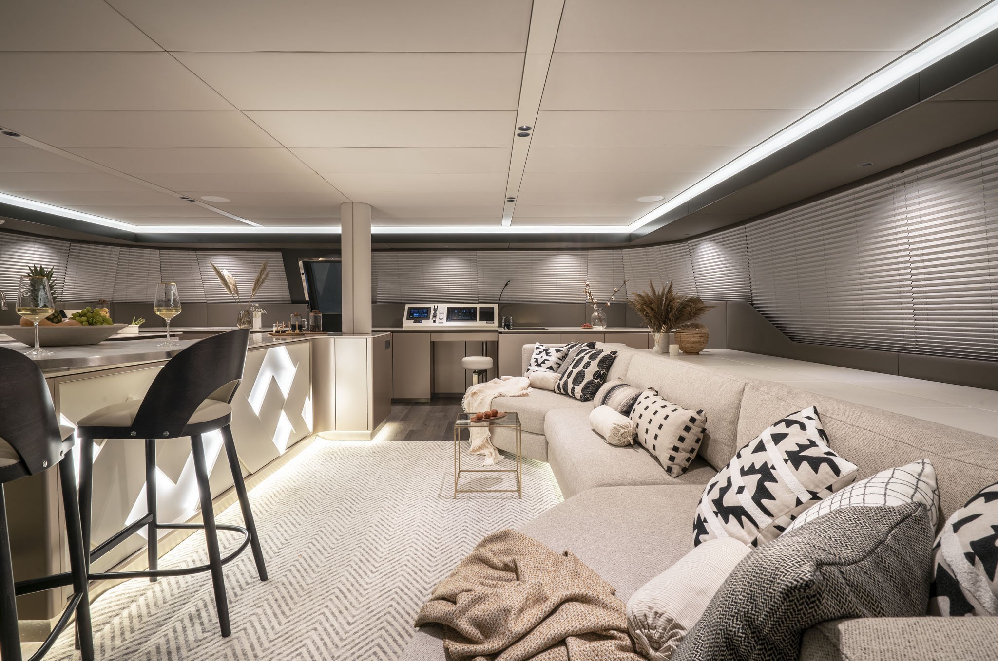Up on the huge flybridge she offers a bar with a barbecue as well as a sofa and sunpads.