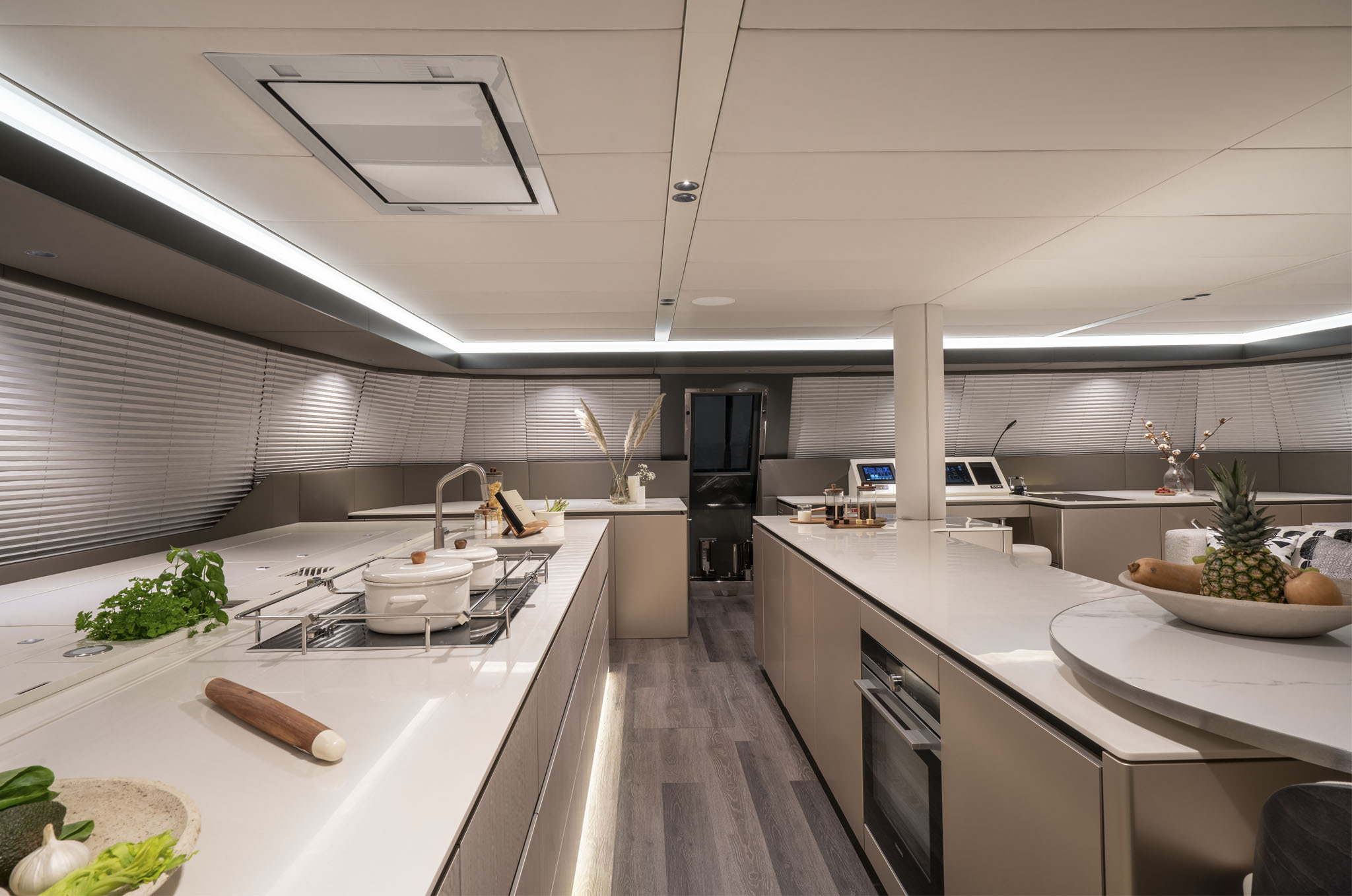 The catamaran’s main deck saloon comprises a well-equipped galley with a large kitchen island and a bar table as well as a generous, luxurious sofa. By day the large windows offer panoramic views and at night the sophisticated lighting creates an elegant ambiance.