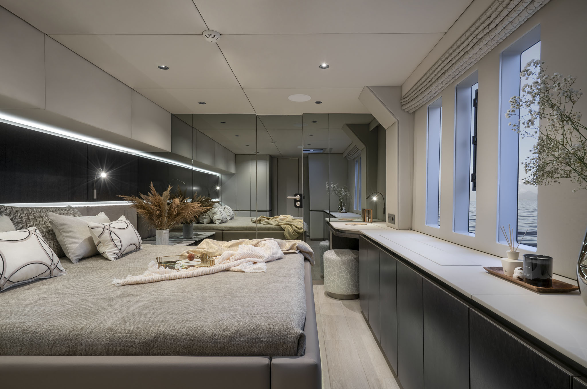 YOLO welcomes up to 8 guests on board thanks to her 4 cabin layout. Her port hull houses a large master suite, fitted with a king size bed, a vanity desk, pop-up TV and generous storage, plus a luxury ensuite.