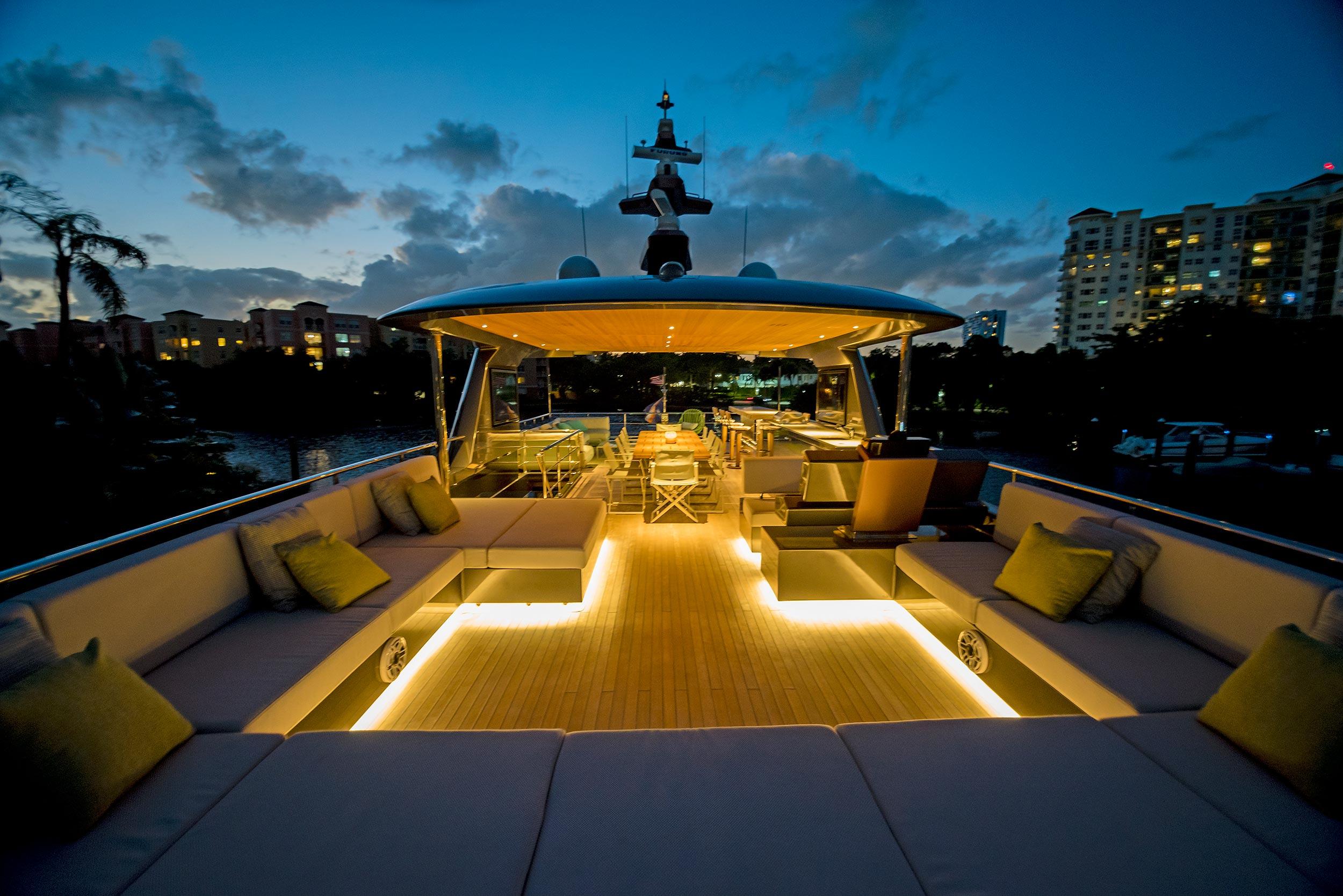 The 76 square meter flybridge deck boasts incredible panoramic views from dining, lounge and bar seating. The exterior spaces all have sophisticated decor.