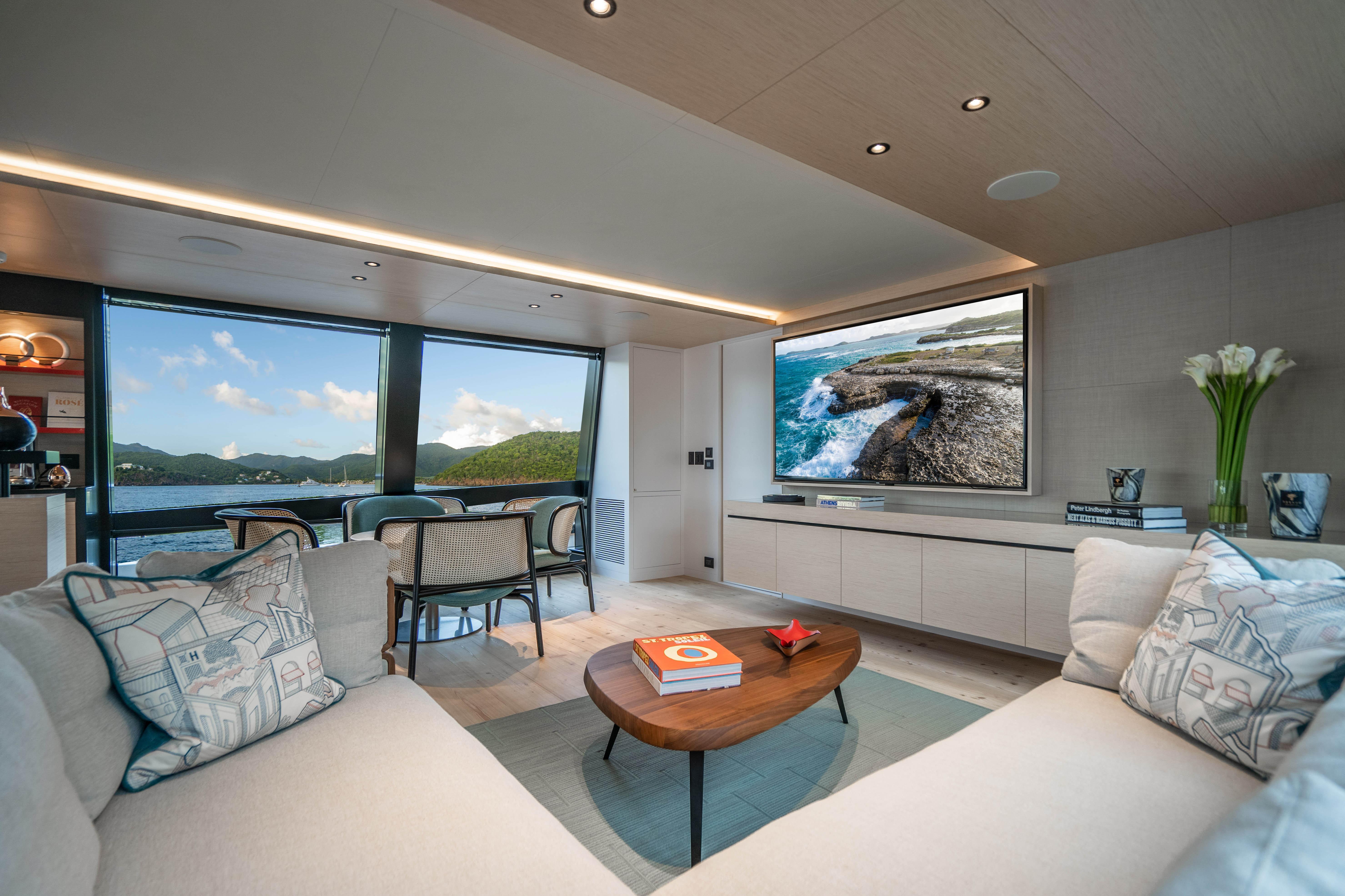 The use of large amounts of glass and light wood furnishings give the main salon a stylish and refined ambiance. Comfortable sofas and dining space offer a substantial indoor space from which to enjoy the fabulous views.