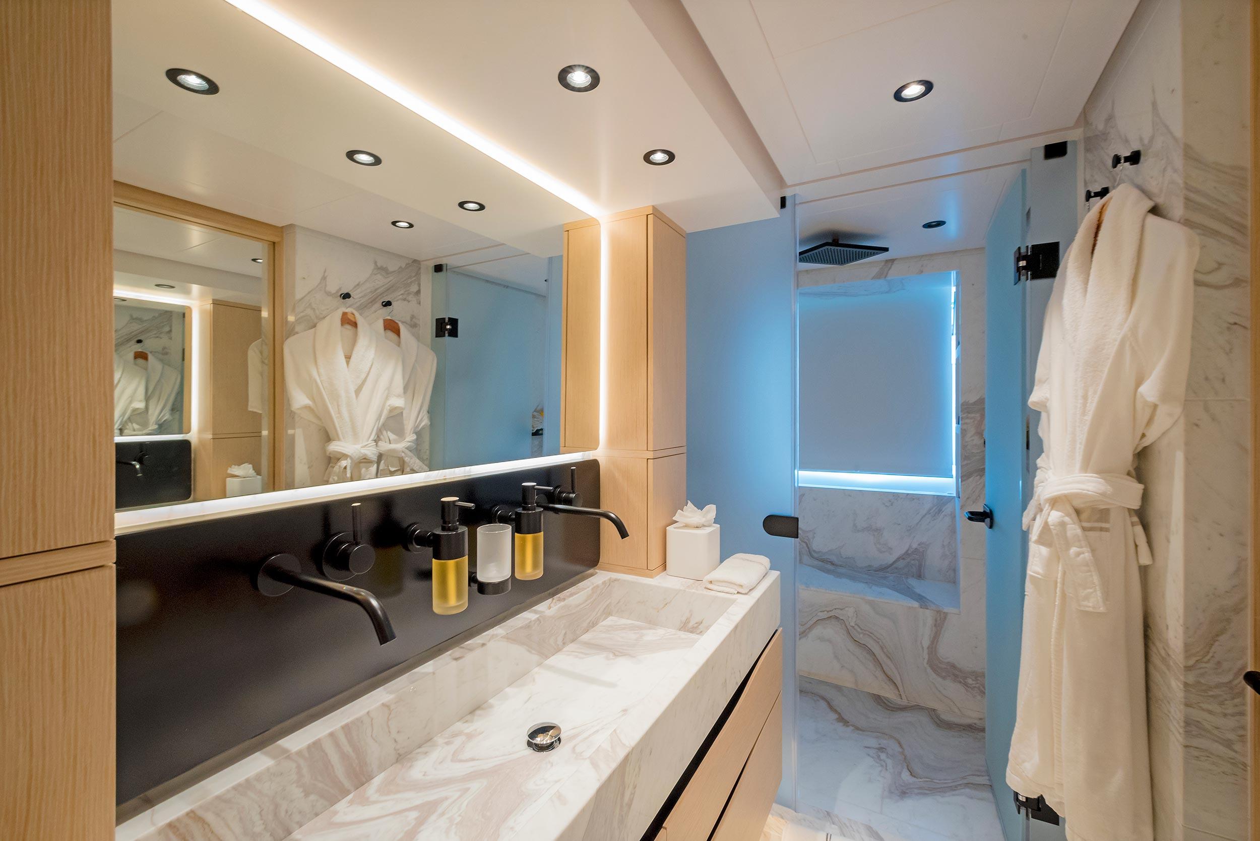 The 76 square meter flybridge deck boasts incredible panoramic views from dining, lounge and bar seating.