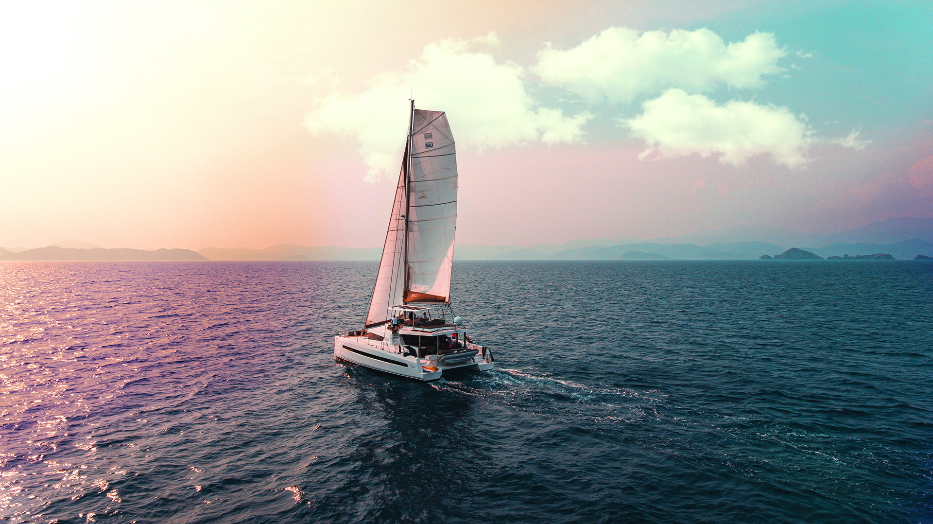 Sailing yacht AMURA is a 17m (55’8”) open space Bali 5.4 catamaran developed by Olivier Ponci at Catana and designed by Xavier Fay in 2021. She has an innovative rigid front cockpit with lounge area as well as open space from the main salon out to the after deck and interior access to the foredeck.