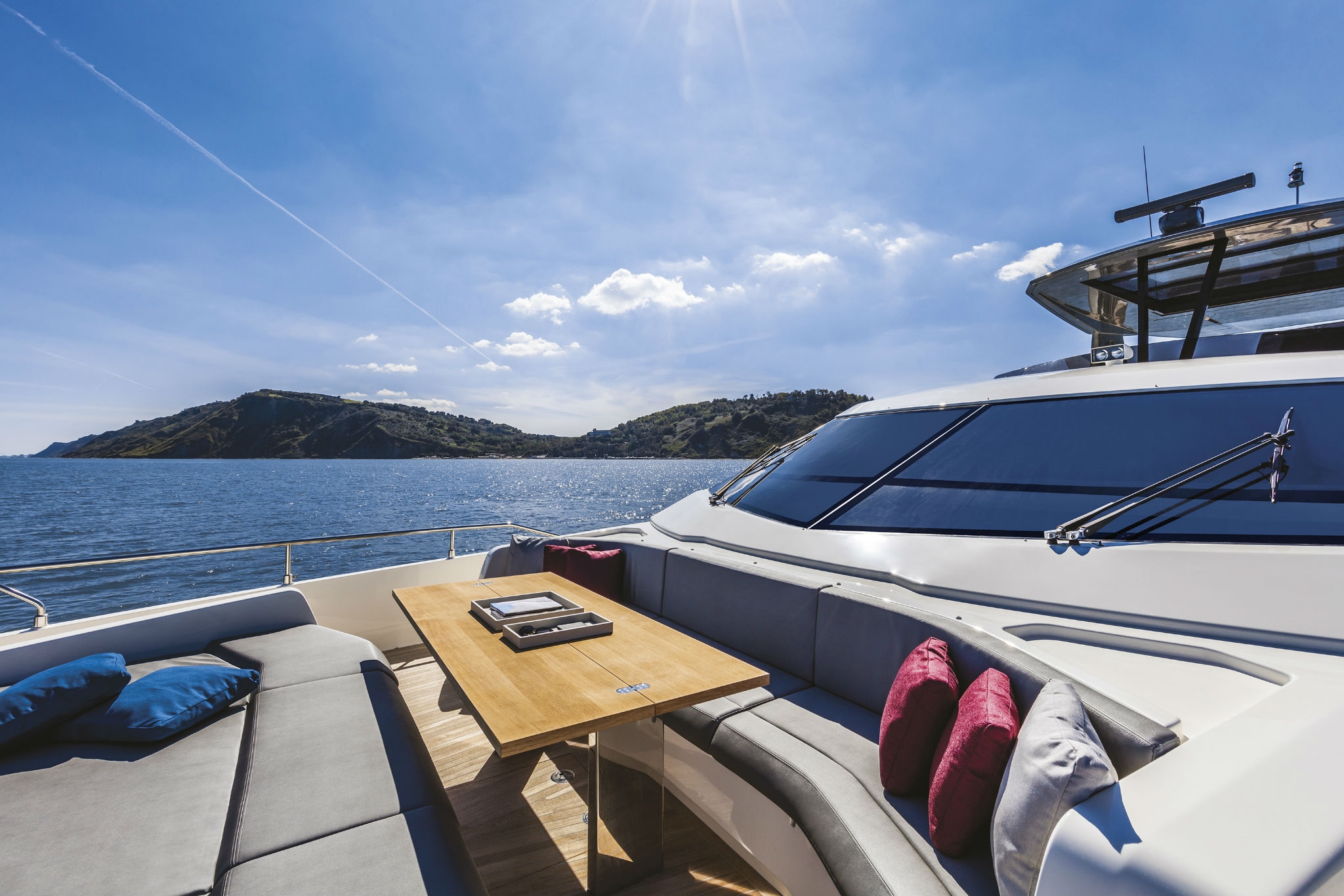 The superior flybridge incorporates a forward helm station and large dining and sun lounging space.