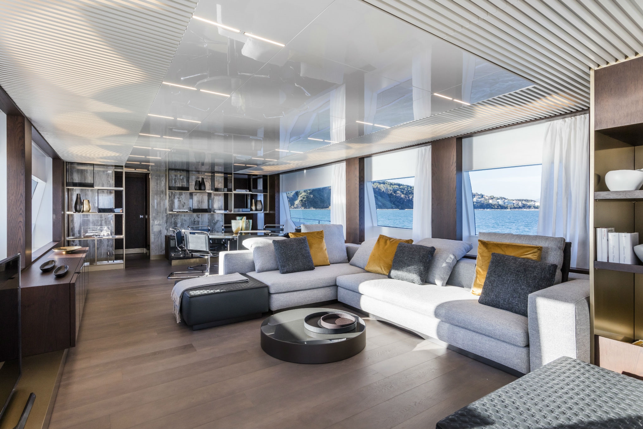 Huge panoramic windows, light wood flooring and neutral furnishings create a light and bright main salon. There is plenty of space for a large corner sofa and TV as well as a sociable round dining table.