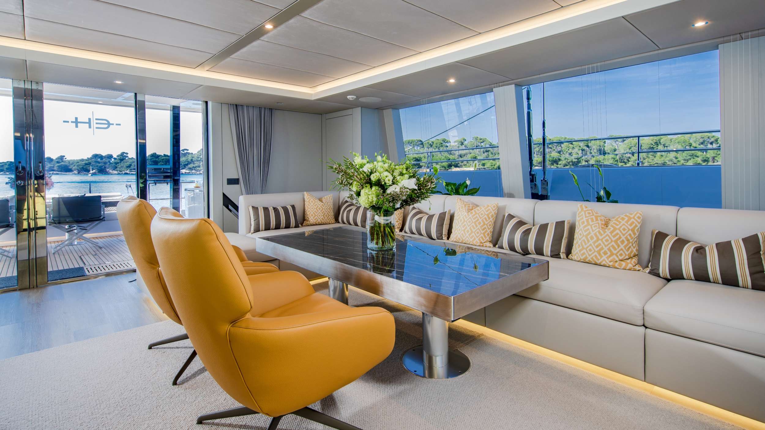 Down to the aft cockpit where a flexible lounge and dining area leads to the swim platform at the stern and directly into the main salon through retractable doors. The bow foredeck offers yet more relaxation space where guests can truly appreciate the excitement of sailing.
