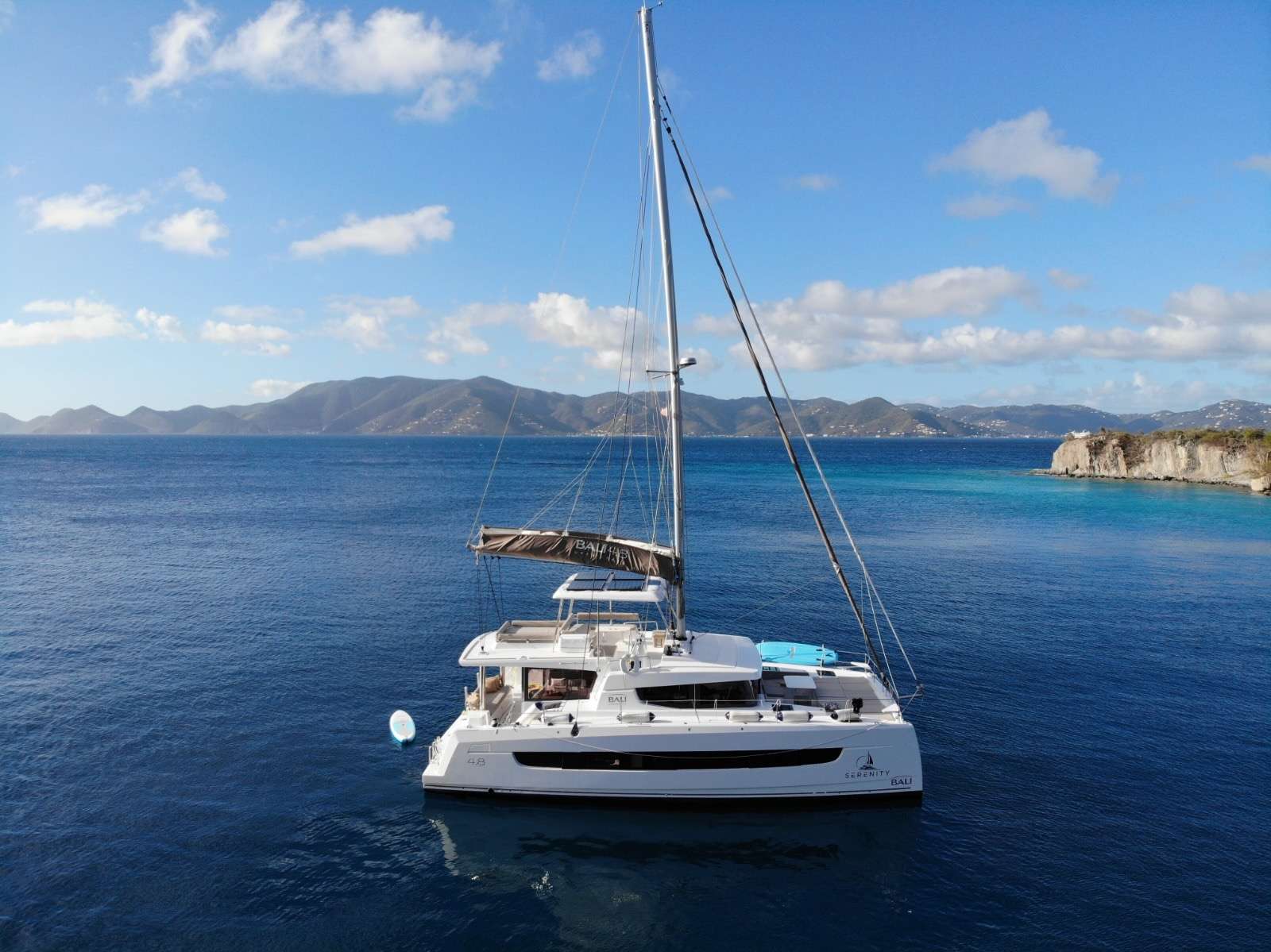 Sailing catamaran SERENITY is a 14.06 m (49’) BALI 4.8 and is the first model of the new generation of BALI catamarans built in 2021. Recognisable at first glance thanks to the updated design of her hulls with thin and straight bows and elegant lines signed Xavier Fäy and Samer Lasta.
