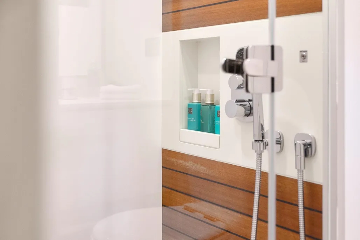 With interior design by Achille Salvagni and large panoramic windows, both internal decks are flooded with light. Eight guests can be accommodated in four luxury cabins, three double and one twin. Three crew members will attend to guests every need to ensure a fantastic charter experience.