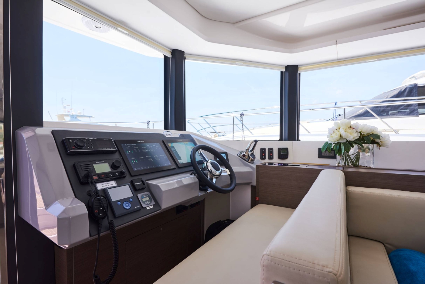 Glass doors lead into the cool atmosphere of the main salon, with its neutral modern décor, panoramic windows and comfortable furnishings. The galley is fitted with state-of-the-art appliances, beautiful counter tops and plenty of storage.