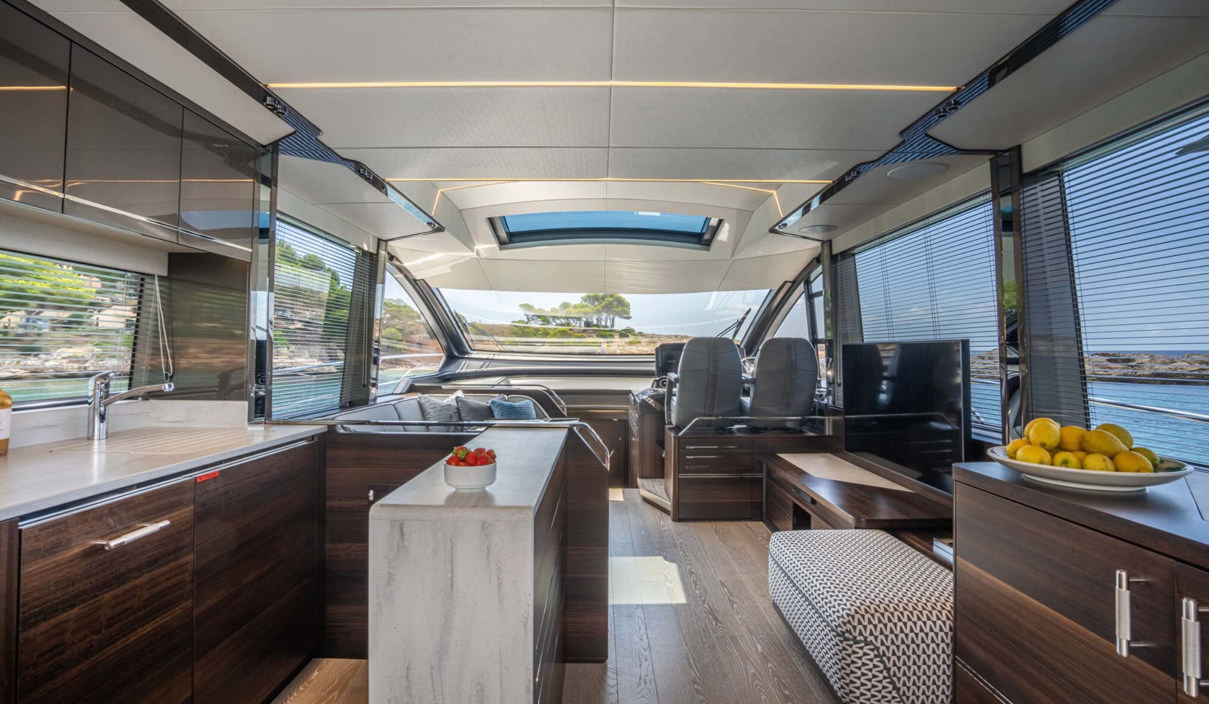 The main salon has panoramic windows, lounge dining area with u-shaped seating and foldable table, galley kitchen and beautiful mixed wood finishings.