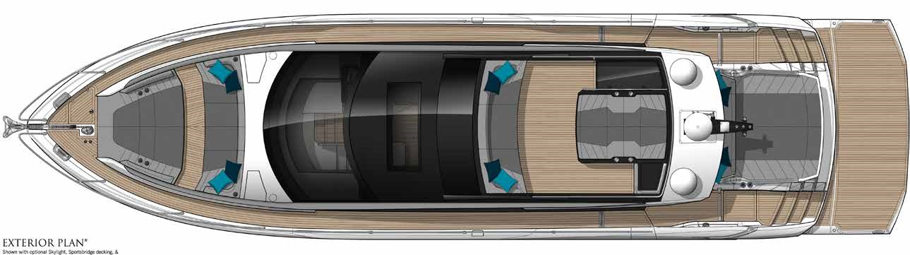The unique SkyHelm creates an almost invisible flybridge profile from which guests can enjoy the exhilarating ride on this sport yacht. FORZA can accommodate seven guests in three cabins.