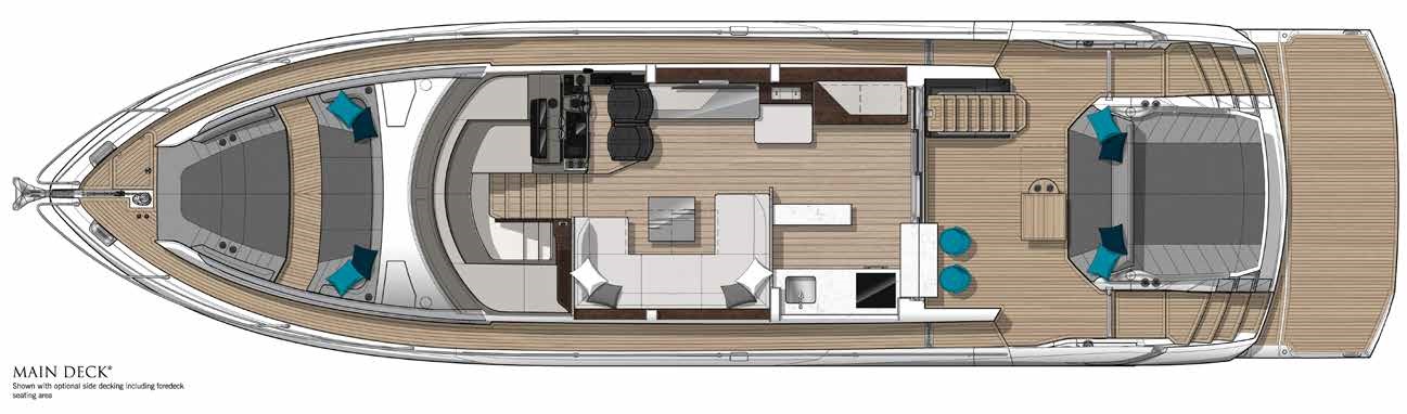 There are plenty of sun lounging areas from which to enjoy the ride with sun pads on the flybridge, foredeck and flexible seating on the aft deck. The aft deck seating also offers a foldable table for al fresco dining. Access to the flybridge is via stylish ladder stairs and two sets of stairs lead down to the swim platform.