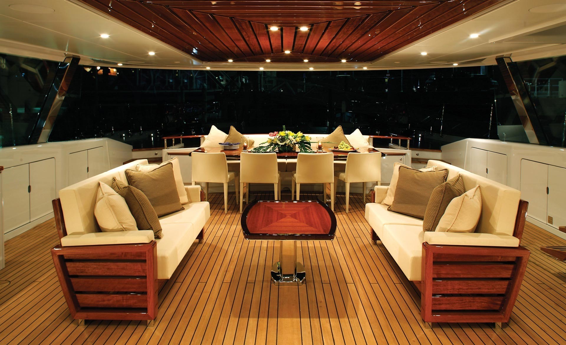 Two identical double cabins side by side and two twin cabins all with ensuite bathrooms. The owner's suite spans the full beam of the yacht, making for a very spacious arrangement. A king sized bed is centerline with a leathertop desk to starboard and leathertop chest of drawers on the port side.