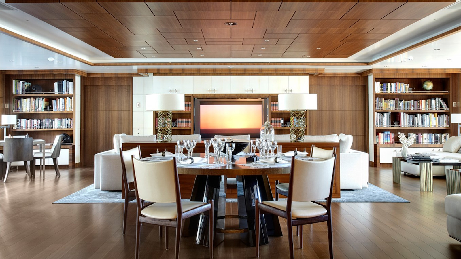 Sofa seating with footrests is placed forward of the swimming pool, and under the upper deck overhang there is a corner sofa and side table plus a bar to port, and an alfresco dining setting to starboard.