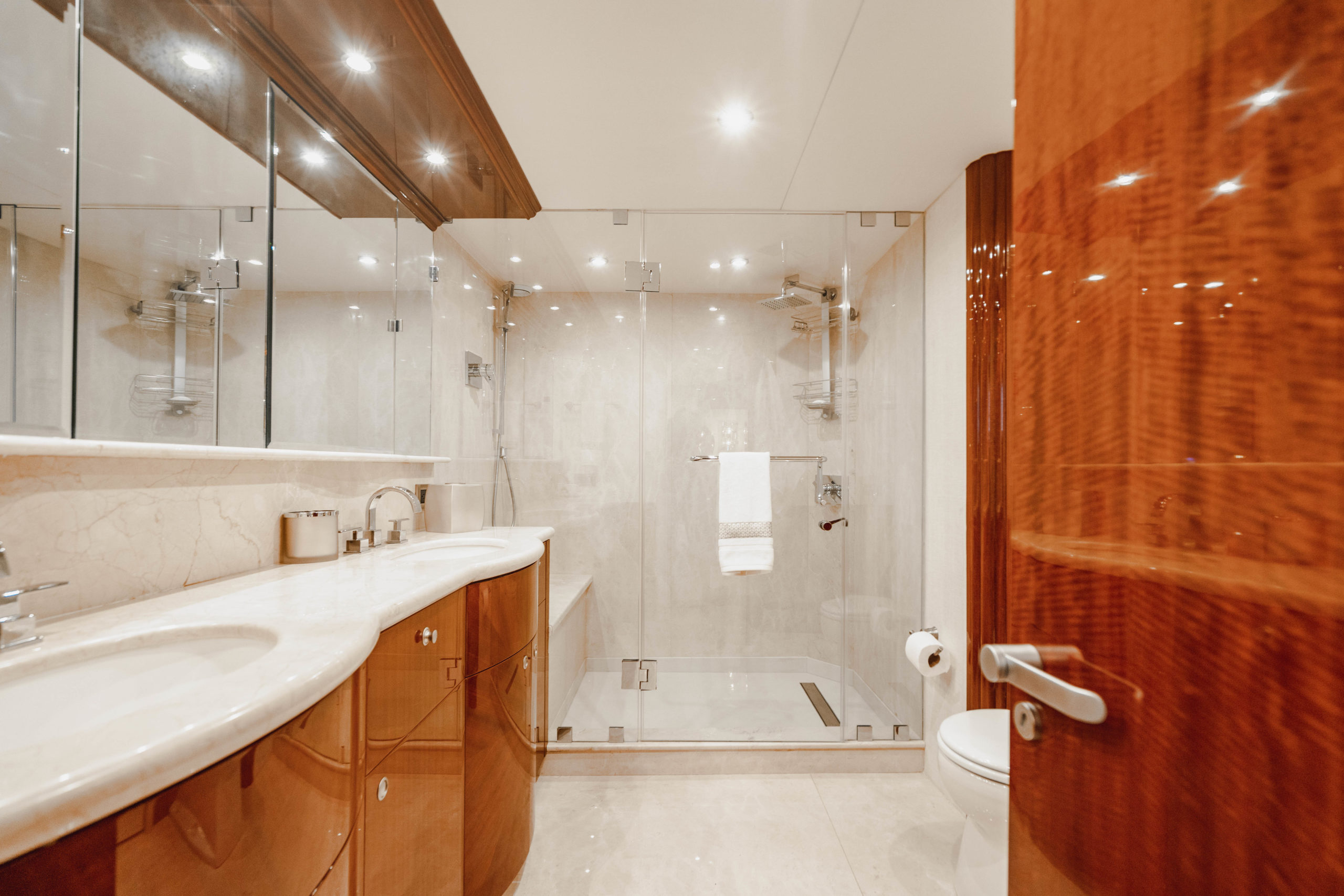 Her spacious, light interior accommodates six guests in three staterooms including a large, full-beam king master and two queen guest staterooms, each with spacious en-suites. A professional crew of three will ensure guests have an outstanding charter experience.
