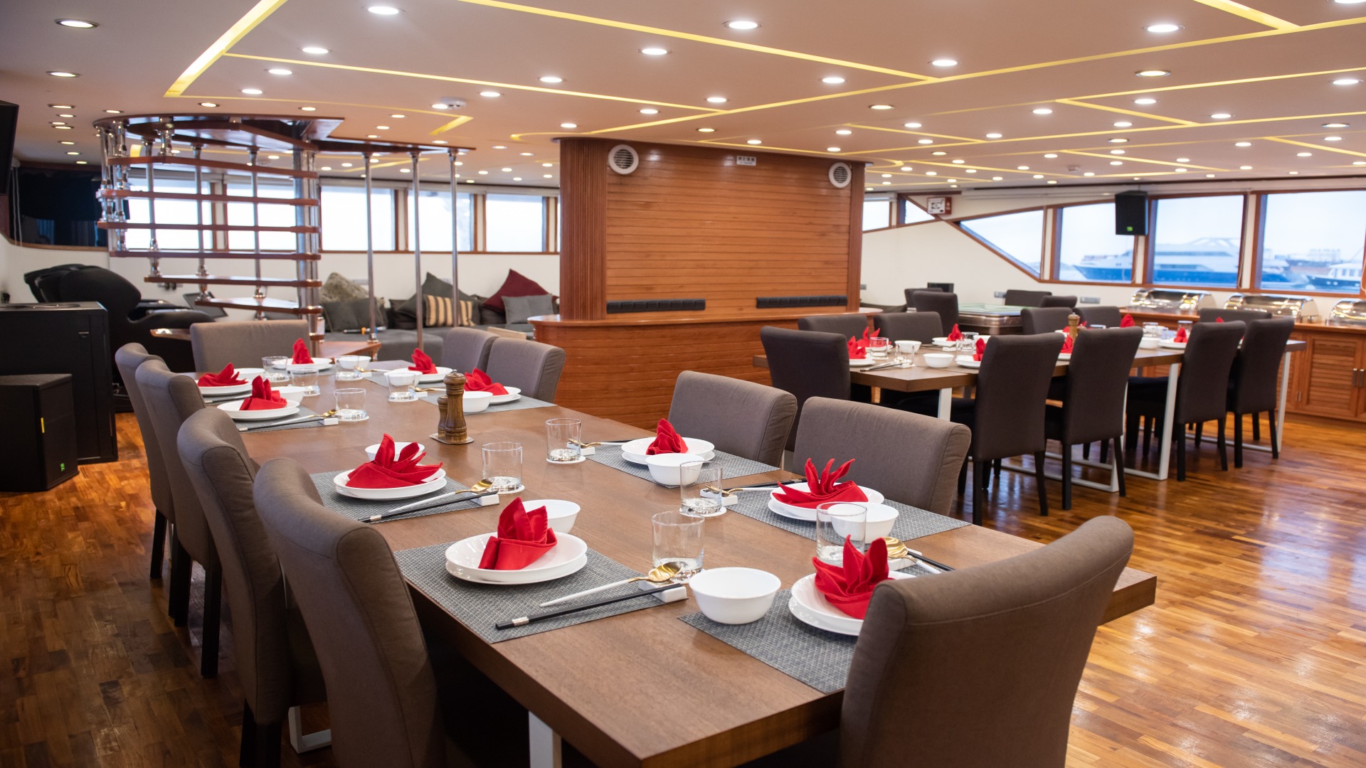 The salon boasts a large seating arrangement and full audio and visual facilities, forward of which is the formal dining room, surrounded by panoramic windows.