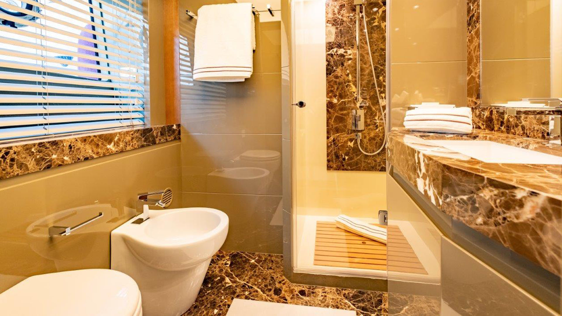 Accommodation is for up to 10 guests sleeping in 5 staterooms all with ensuite facilities. The full-beam master stateroom is on the main deck forward, 2 double cabins and 2 convertible double/twin cabins on the lower deck.