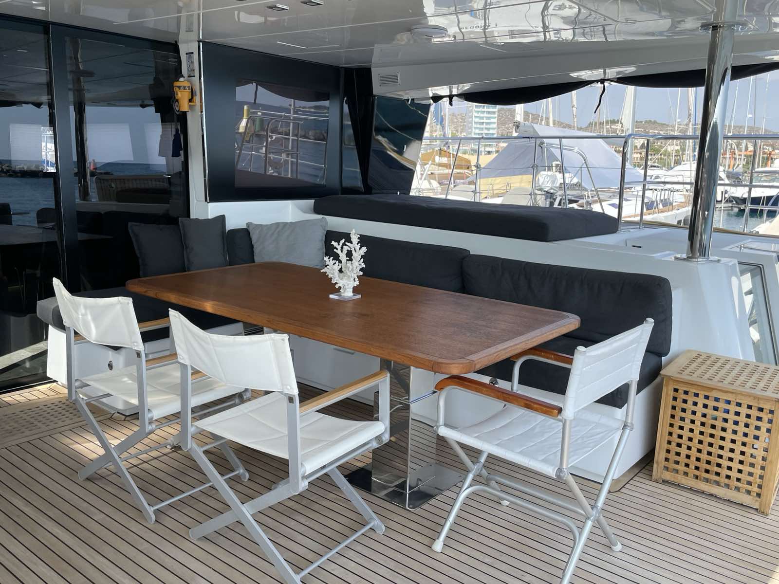 She offers guests a hardtop bimini with sunbed cushions on the flybridge and a spacious main deck.