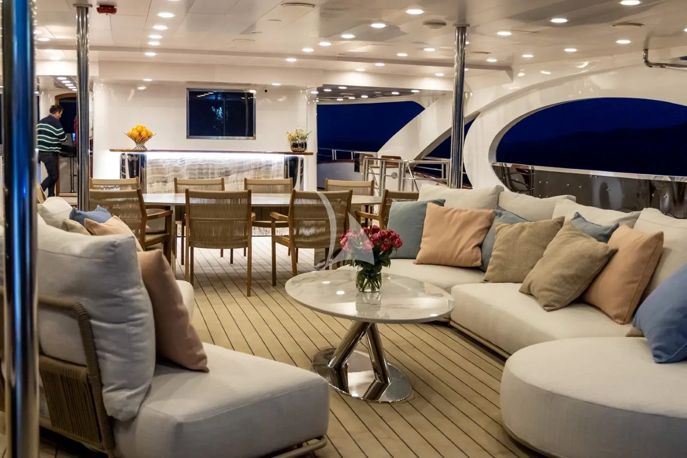 The interior on the main deck is divided: a dining salon offers minimalist, neutral décor, large windows, plenty of dining space and a fully stocked bar; a sophisticated lounge provides a quiet atmosphere for guests to relax on comfortable sofas with elegant soft furnishings.