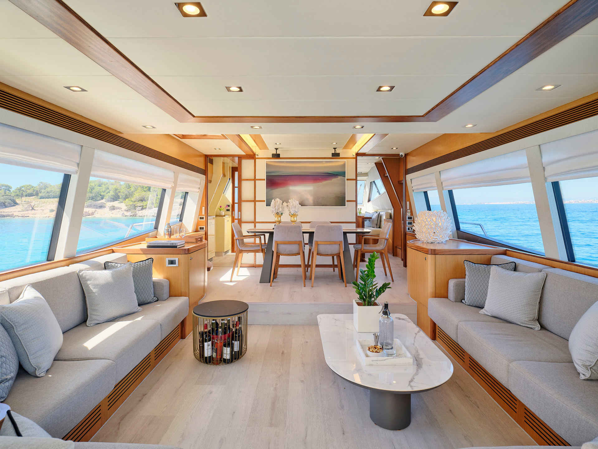 The main salon has a light and contemporary feel, with plenty of soft furnishings in the lounge area directly in from the aft deck and a stylish marble dining table amidships. The salon is enhanced by the extensive windows by day and soft lighting by night.