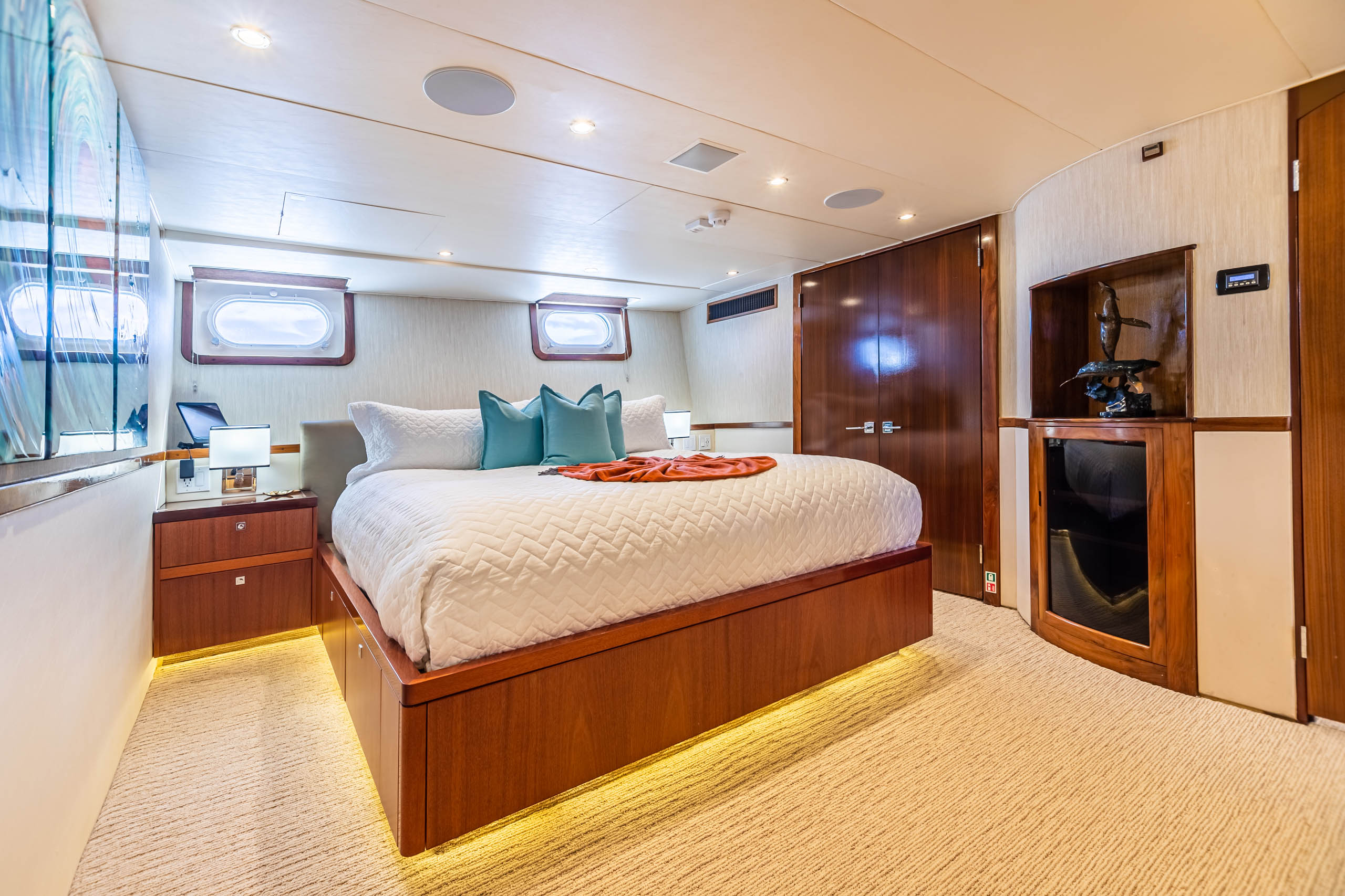 There is ample closet space, ensuite bathroom with double vanity and large tub/shower combo with double shower heads. Two identical double cabins are located amidships and feature walkaround Queen beds in each, ensuite bathroom with shower, TV, entertainment system and iPad control.