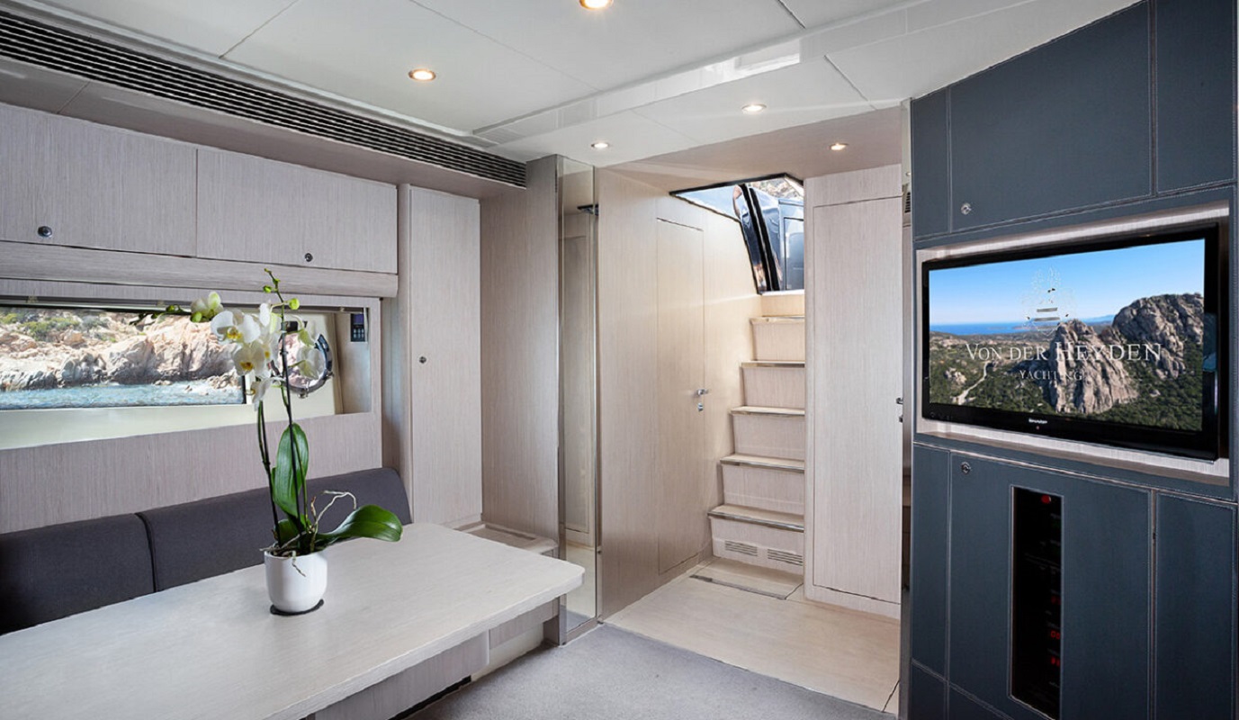 The spacious lower saloon offers guests a comfortable settee and dining table suitable for six to eight guests, plus a practical galley along the port side.