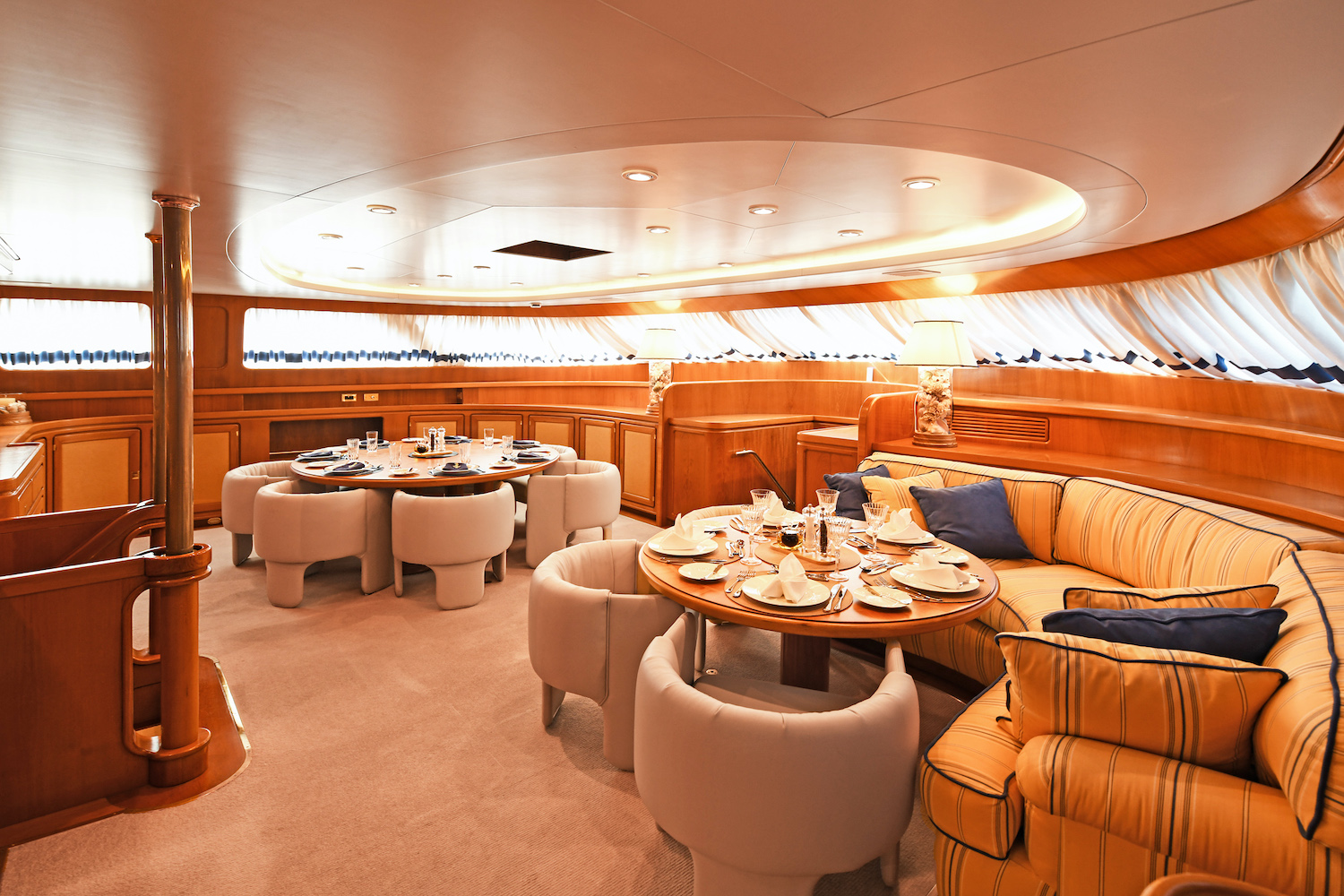 The elegant main aft deck provides guests with a beautiful, curved dining area and enough space for a separate lounge area with a hardcover. Two gentle staircases lead up to the port and starboard gangways towards the foredeck. The flybridge is equally exquisite, with soft white benches and sunpads completed with mahogany wood finishes.