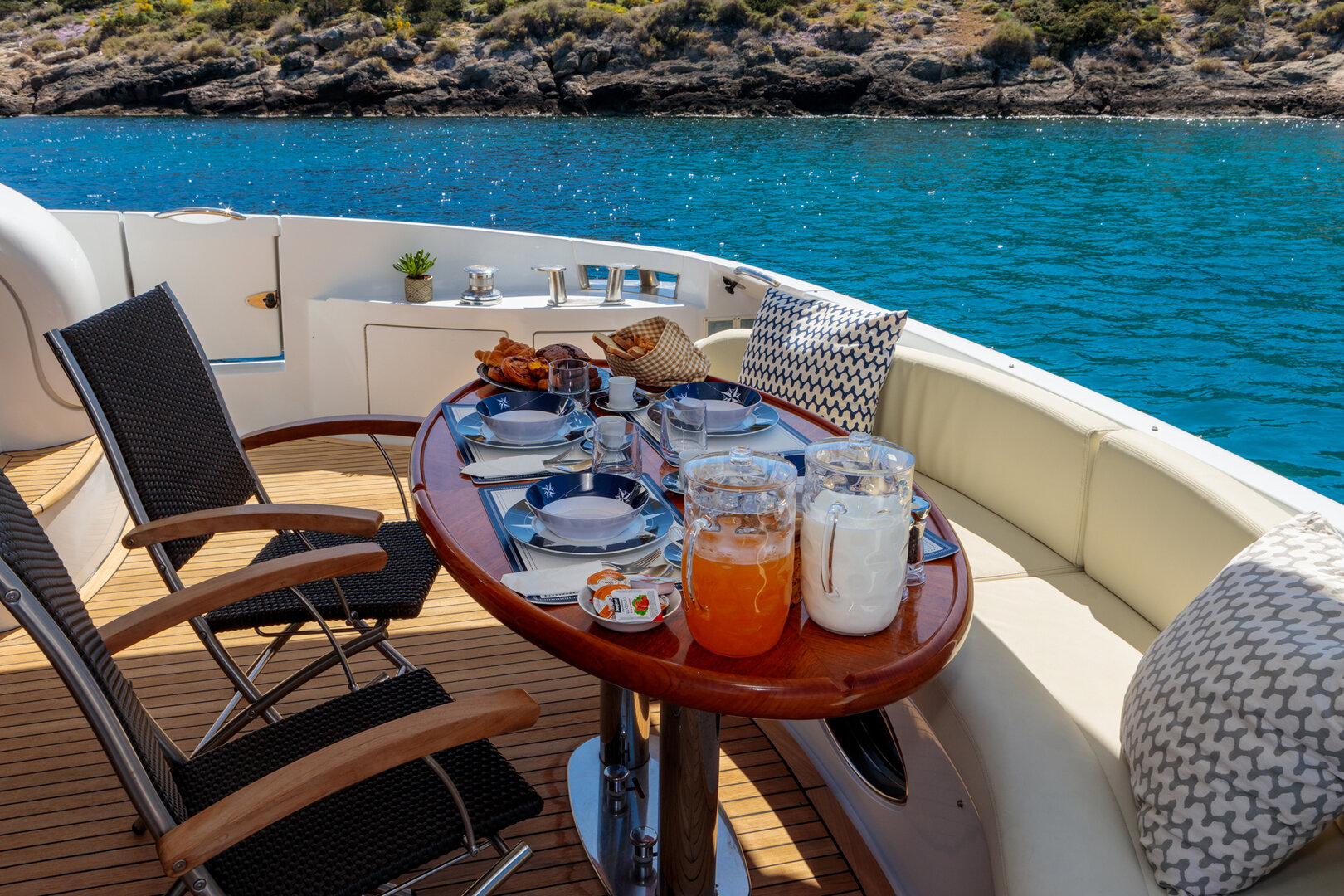She has plenty of exterior areas to enjoy the sun with dining options at the aft and sundeck. With four cabins all en-suite, eight charter guests can be accommodated with three crew members offering fabulous service.
