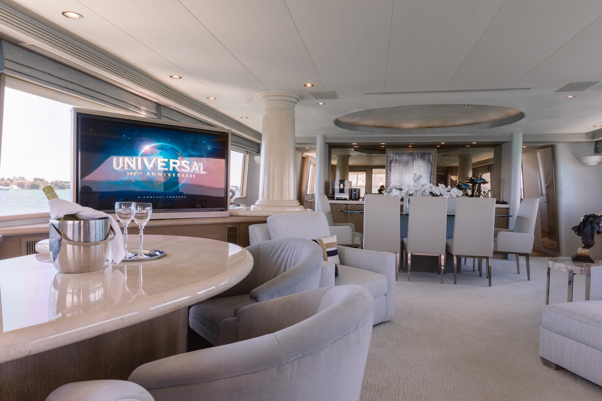 The main salon has an open-plan design with a formal dining area forward, a relaxing lounge area and a low-level bar adjacent to the aft deck doors. The impressive panoramic windows, neutral décor and soft lighting create a welcoming atmosphere.
