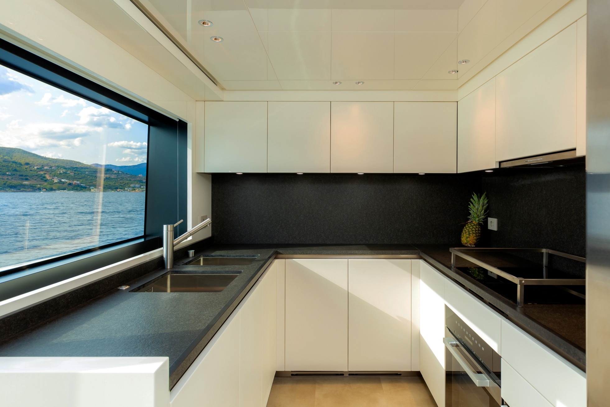 The galley is forward to starboard and leads through to an intimate dining room which is bathed in natural light. From here guests can enjoy views across the bow and take the elegant floating staircase to the sky lounge.