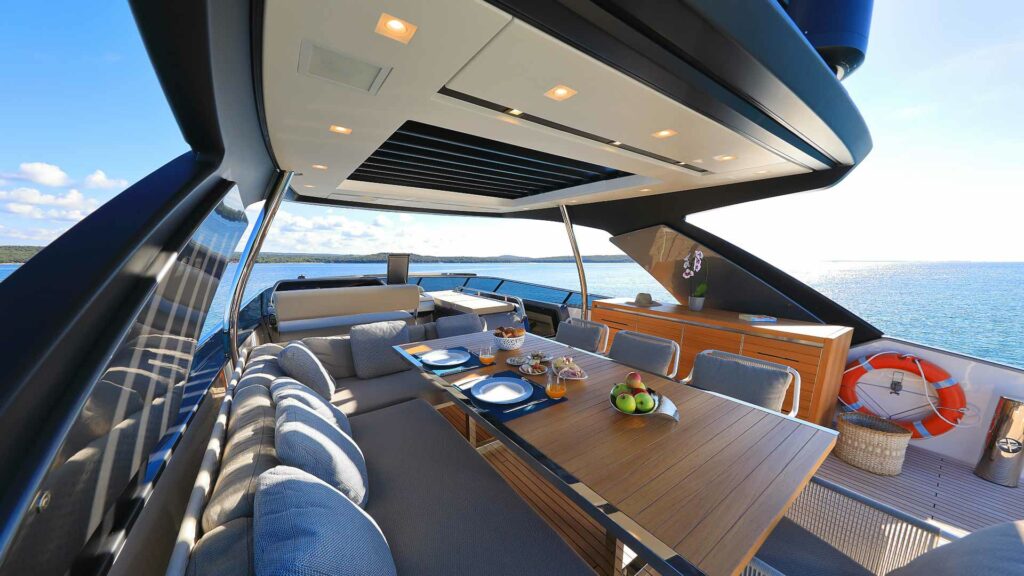 The foredeck has a lovely lounge area which can be covered with a soft bimini to create a relaxing shaded space. The main deck aft is an ideal location for guests to enjoy al fresco dining around the generous dining table.