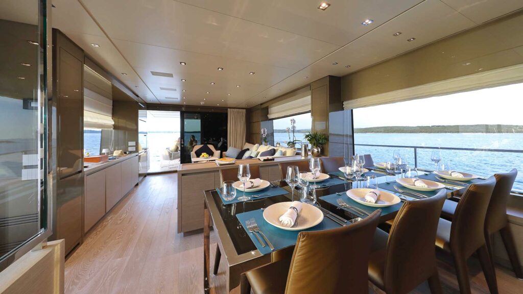 The main salon is accessible from the aft deck and offers guests a stylish haven, decorated with cool neutral wood and soft, comfortable furnishings. This guest space offers a lounge aft and dining room amidships while the working area of the main deck sees the galley and bridge forward.