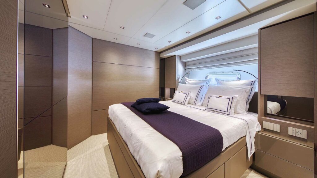 The guest suites are configured as; one full beam primary suite with luxury ensuite, generous wardrobe space and vanity / study area; one double with ensuite forward; and two twin ensuites amidships. All the cabins share the cool neutral décor of the communal spaces.