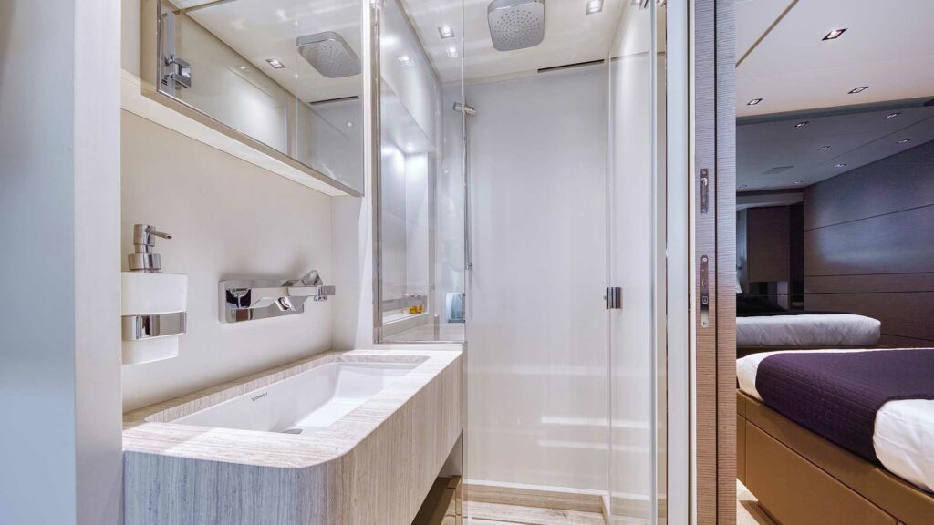 The guest suites are configured as; one full beam primary suite with luxury ensuite, generous wardrobe space and vanity / study area; one double with ensuite forward; and two twin ensuites amidships. All the cabins share the cool neutral décor of the communal spaces.