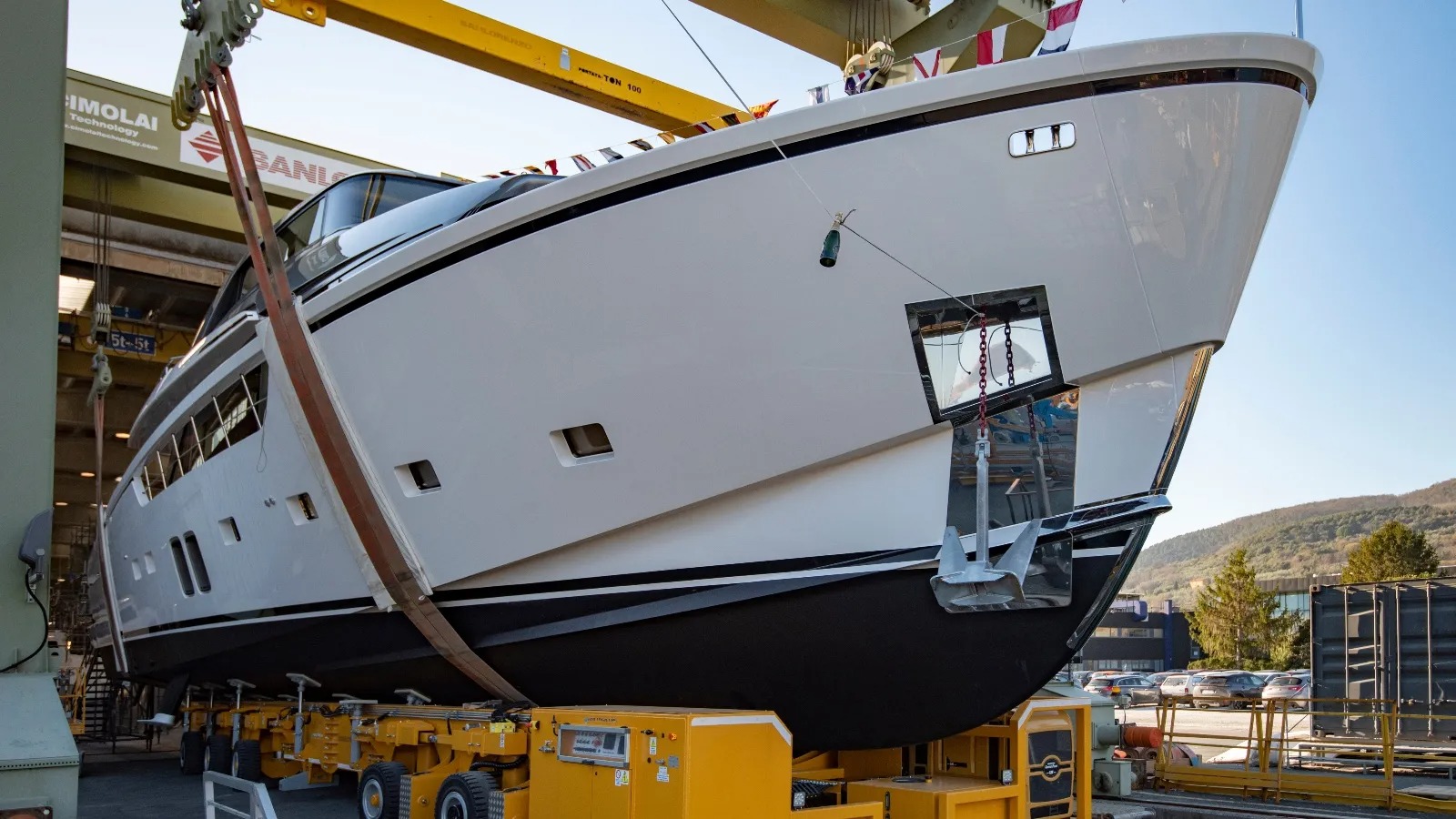 The crossover flybridge yacht features fully customised design by Officina Italiana Design (Mauro Micheli). Accommodation is for up to eight guests looked after by a capable three-person crew.
