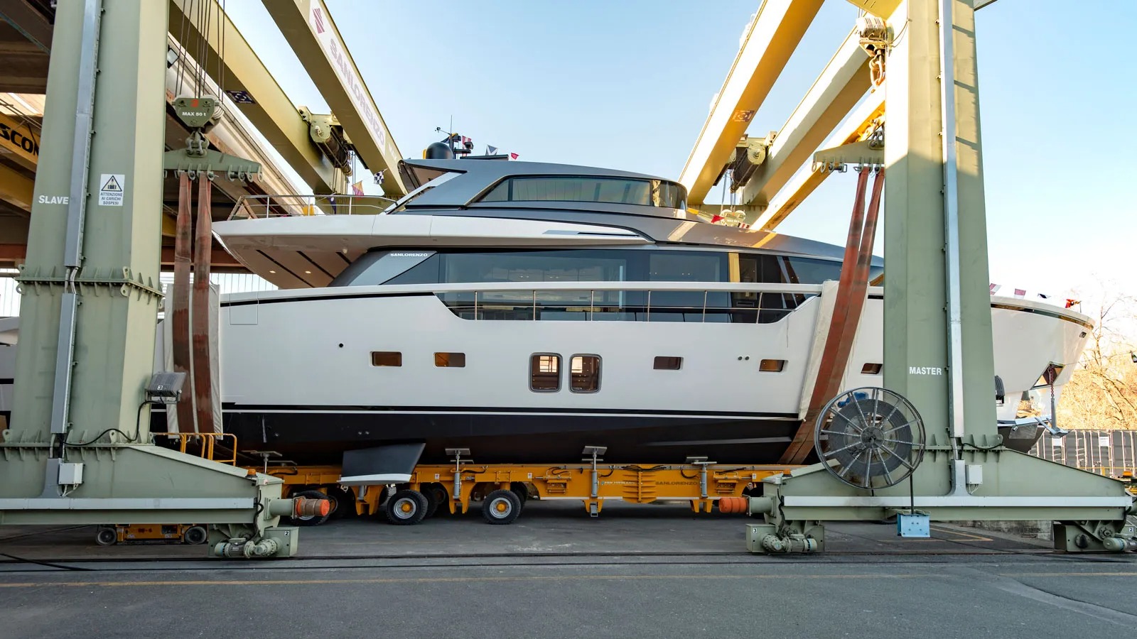 The crossover flybridge yacht features fully customised design by Officina Italiana Design (Mauro Micheli). Accommodation is for up to eight guests looked after by a capable three-person crew.