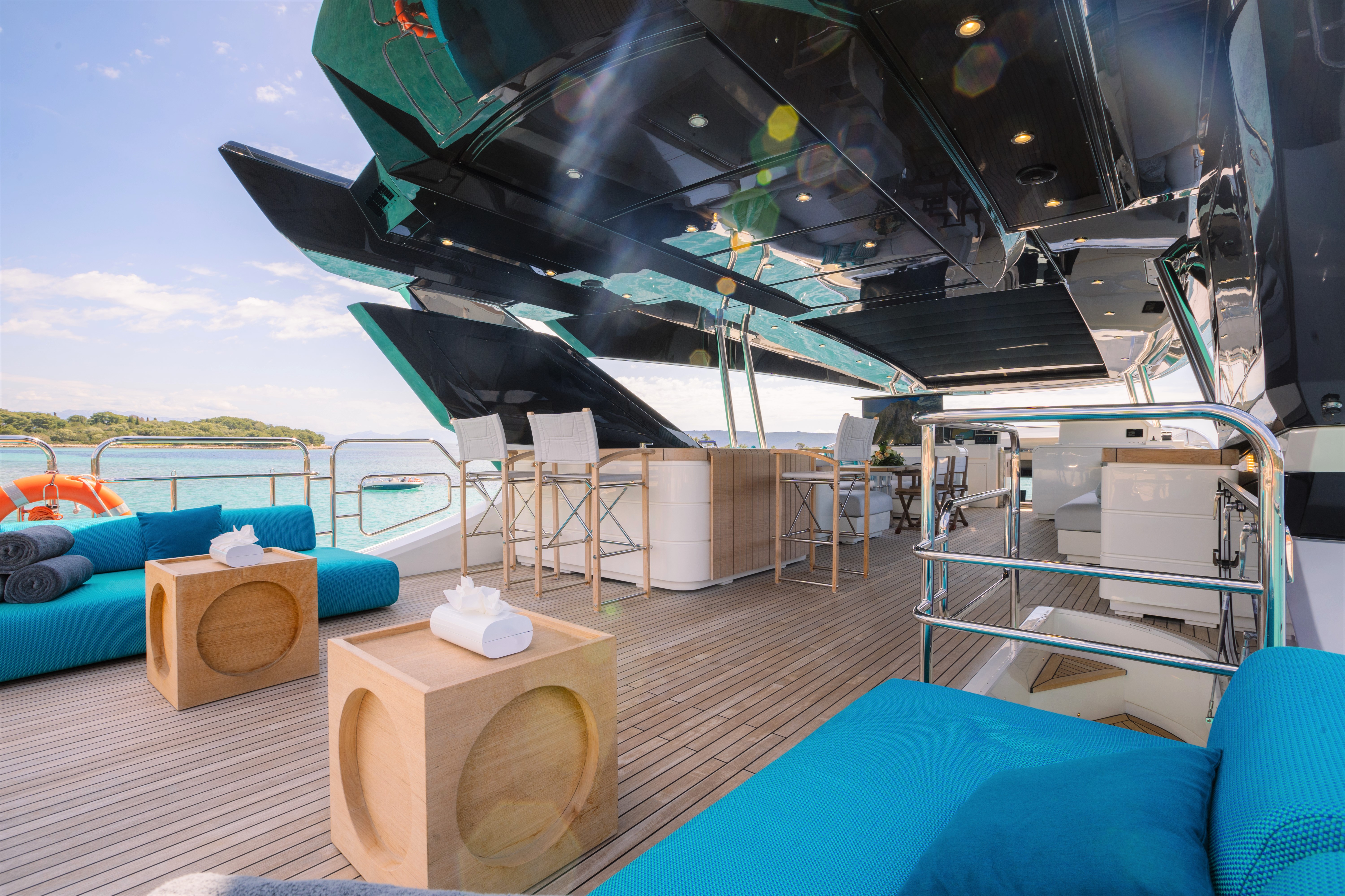 The long sleek lines of ROCCO allow for a sizeable guest space on the foredeck which can be covered with a soft bimini. Sun pads lead down to a comfortable seating and casual dining area.