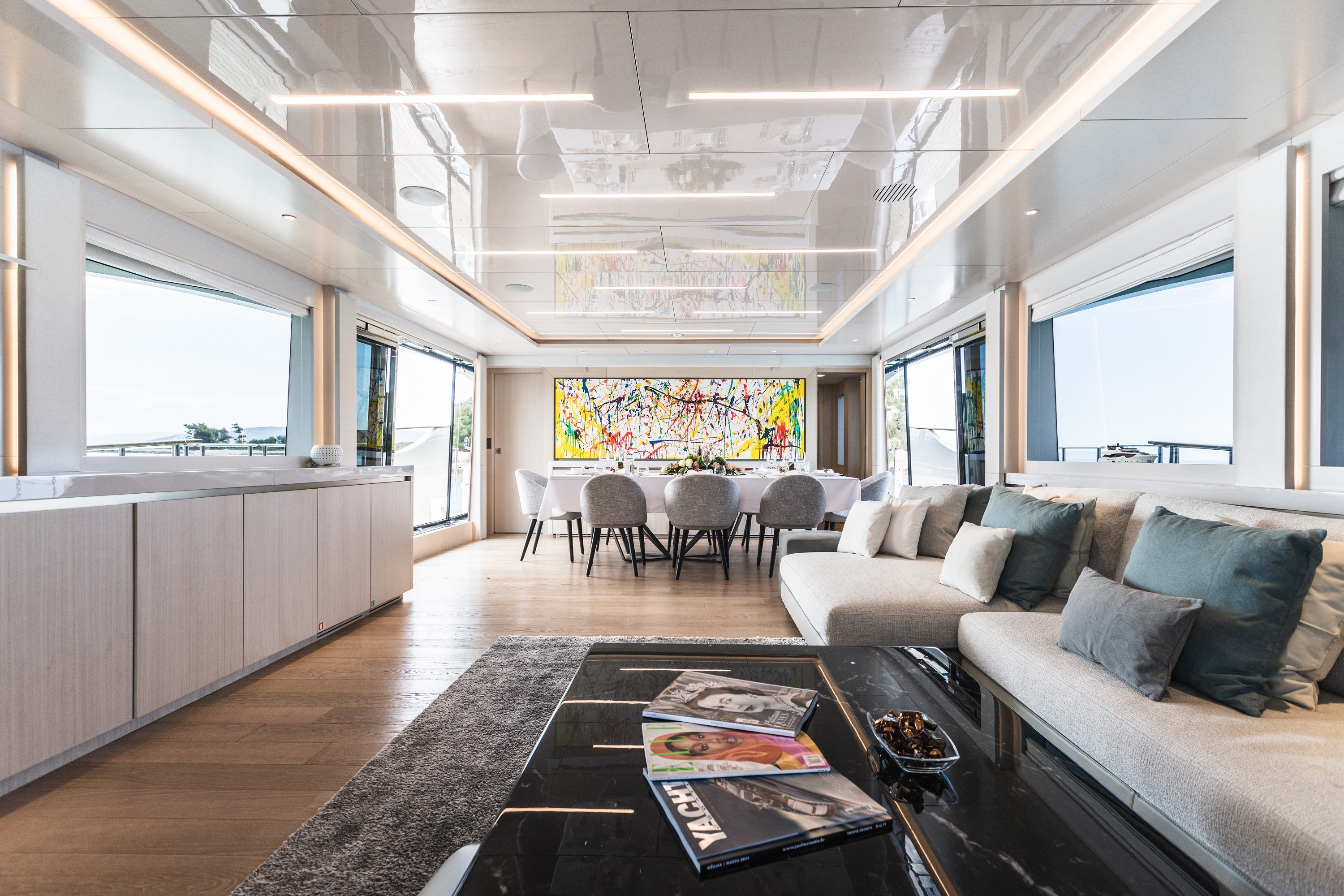 The main salon is flooded with light thanks to the glass doors, light wooden flooring and reflective surfaces. The lounge area is aft and a dining setting is forward with access to the fold out balconies. Her beautiful master suite is located forward on the main deck, allowing ample room for the guest cabins on the lower deck.