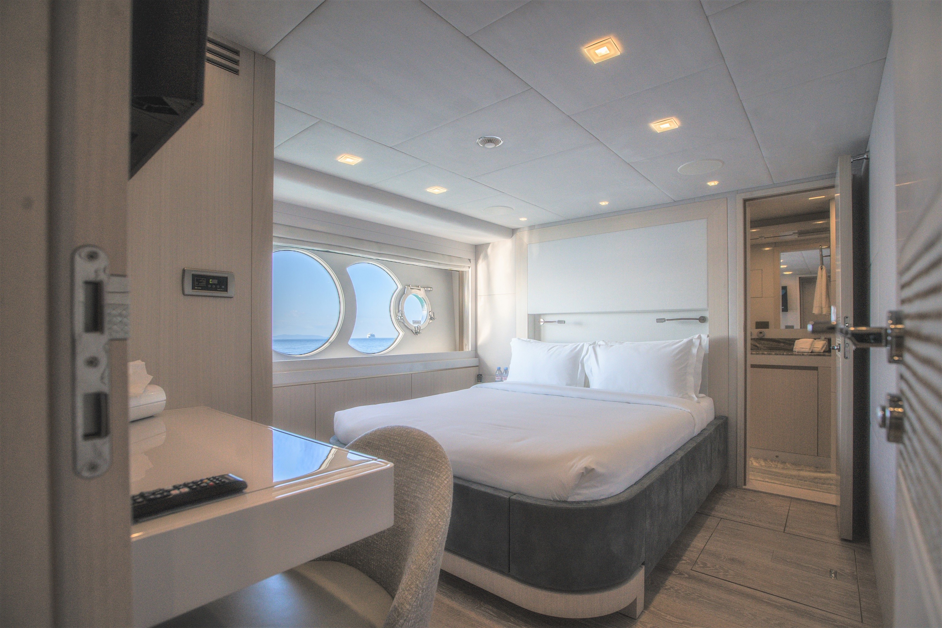 Her beautiful master suite is located forward on the main deck, allowing ample room for the guest cabins on the lower deck. The master offers charter guests a peaceful and tranquil atmosphere, a haven away from the busy comings and goings of yacht life with light wood finishes and crisp white linens.