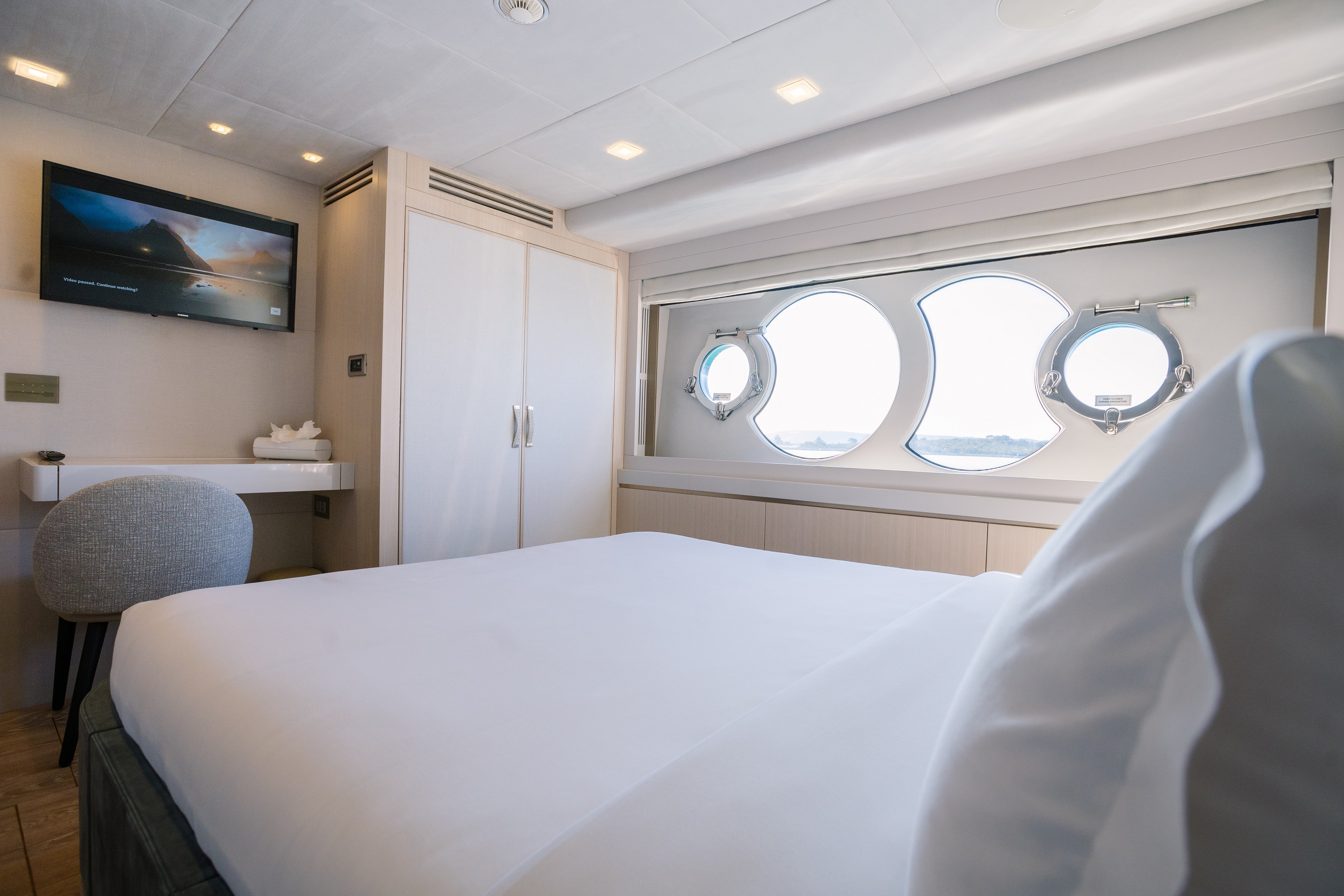Her beautiful master suite is located forward on the main deck, allowing ample room for the guest cabins on the lower deck. The master offers charter guests a peaceful and tranquil atmosphere, a haven away from the busy comings and goings of yacht life with light wood finishes and crisp white linens.