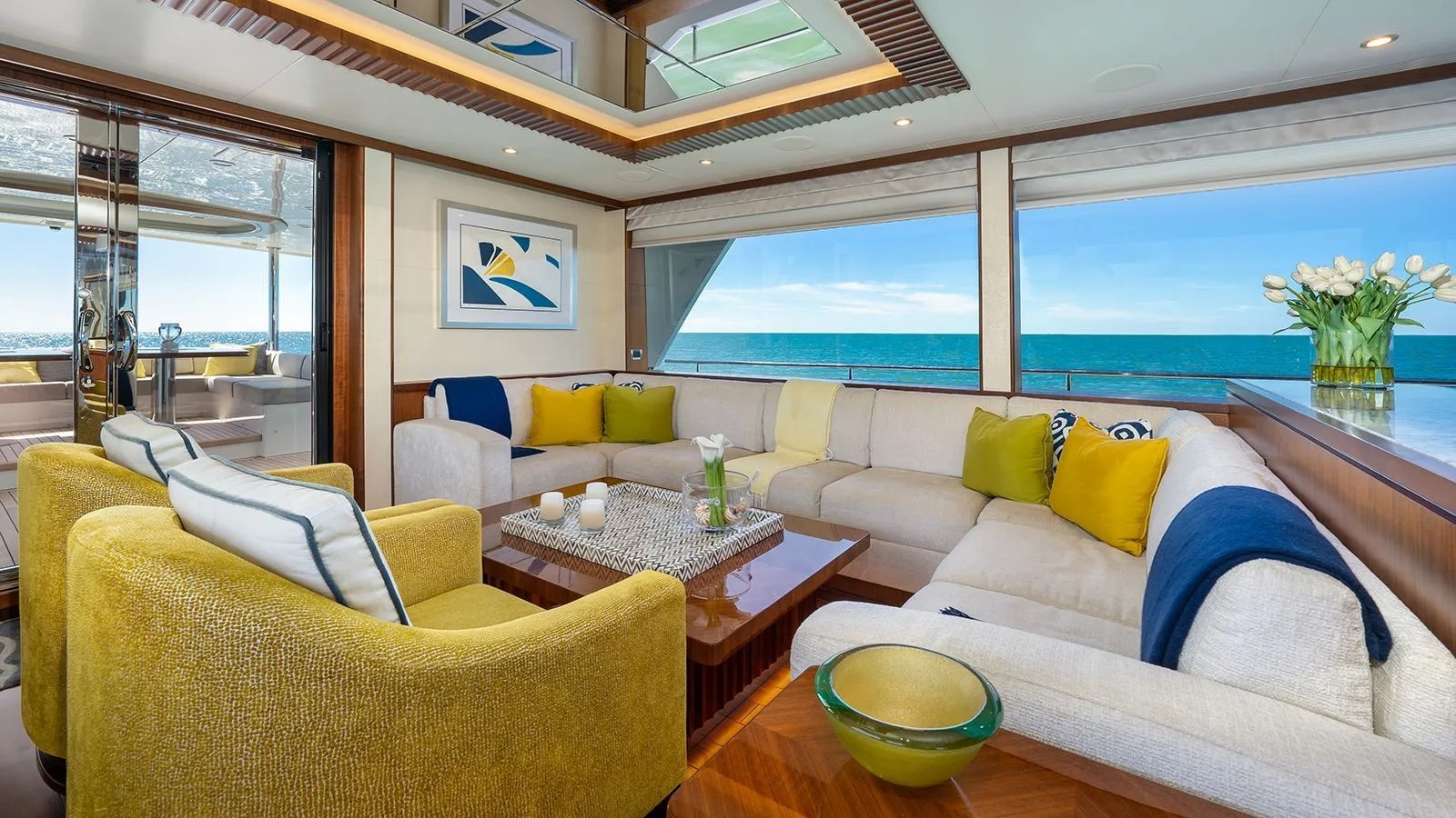 There is access directly into the main salon through sliding glass doors. Steps on either side lead down to the swim platform with access to the ocean and selection of water toys.