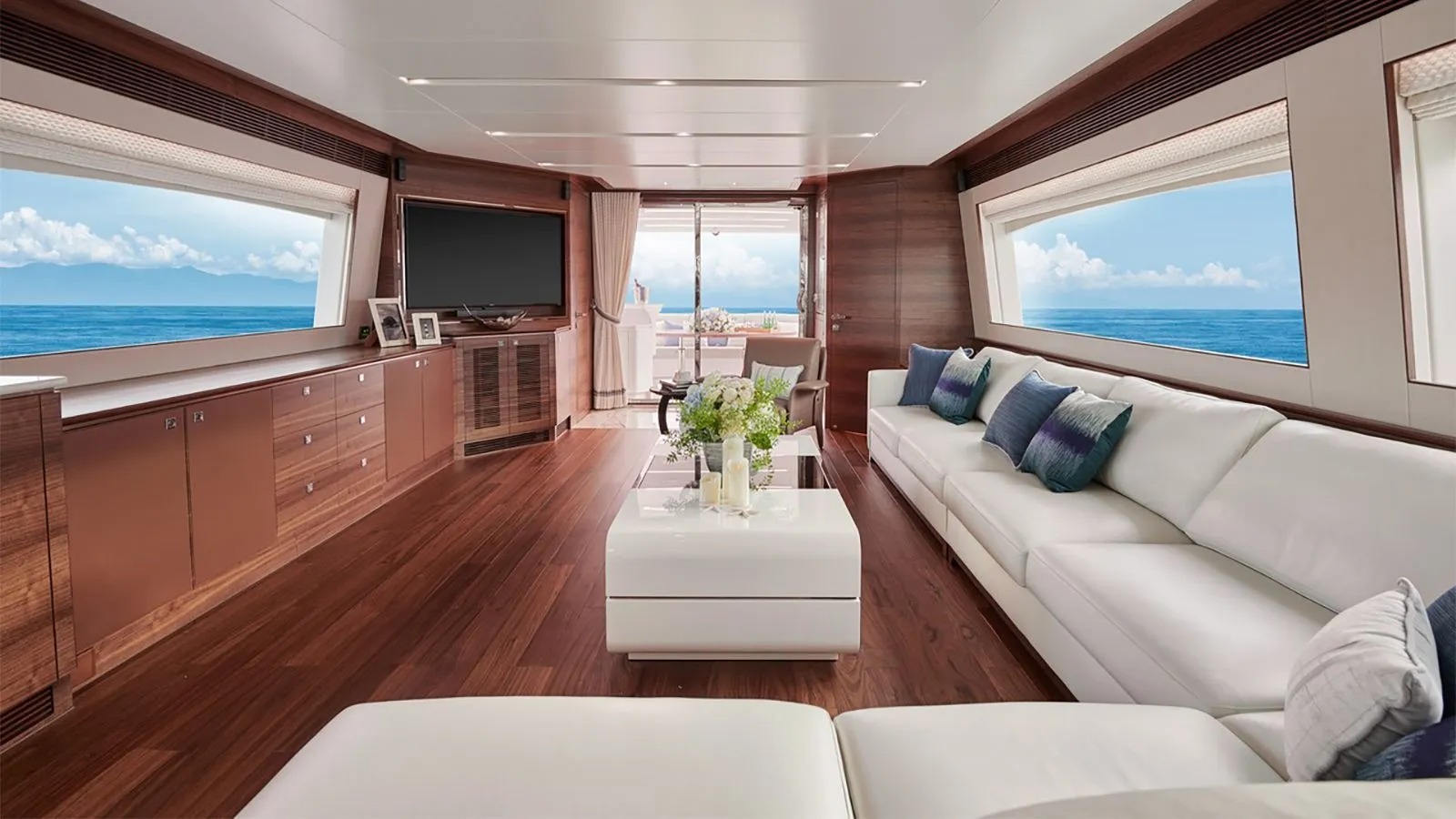 Wide panoramic windows and the full-length open layout give the main deck salon a light and spacious feel. Inside the aft deck doors guests enter the lovely lounge area which leads through to a galley bar which can be open or closed to the dine in galley.